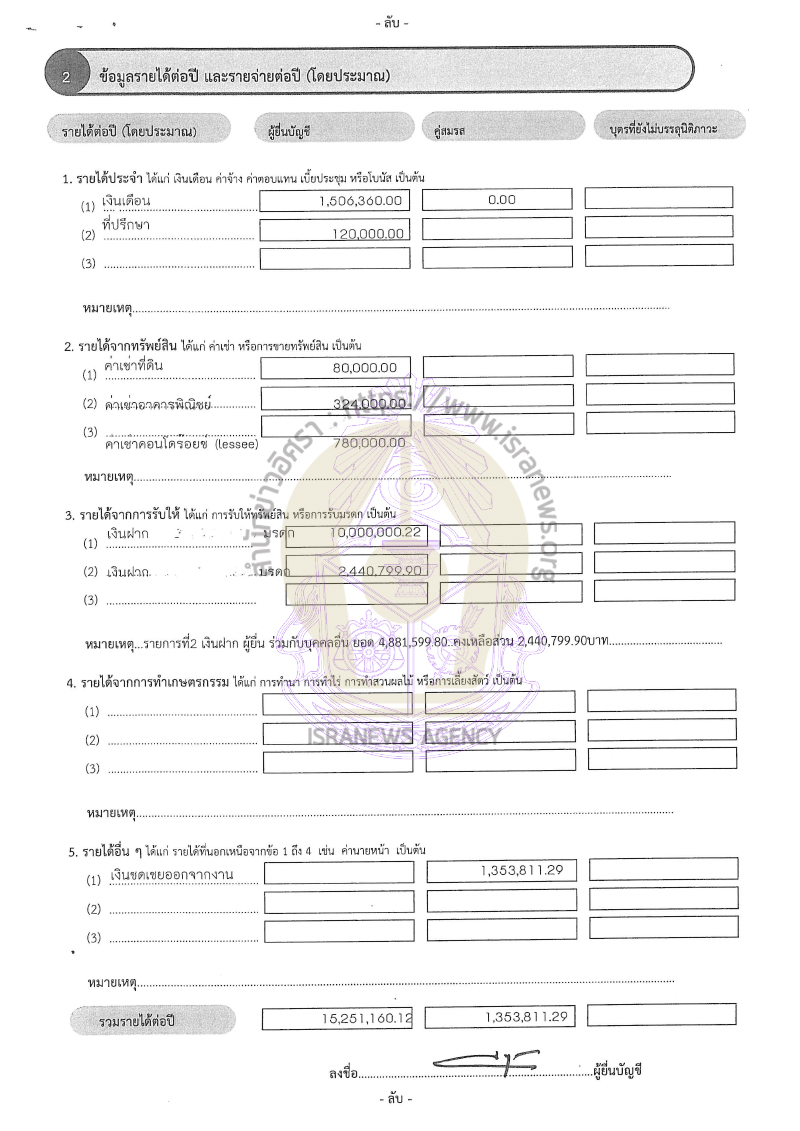 คู่สมรส แจ้งมีรายได้ต่อปี 1,353,811.29 บาท เป็นเงินชดเชยออกจากงาน