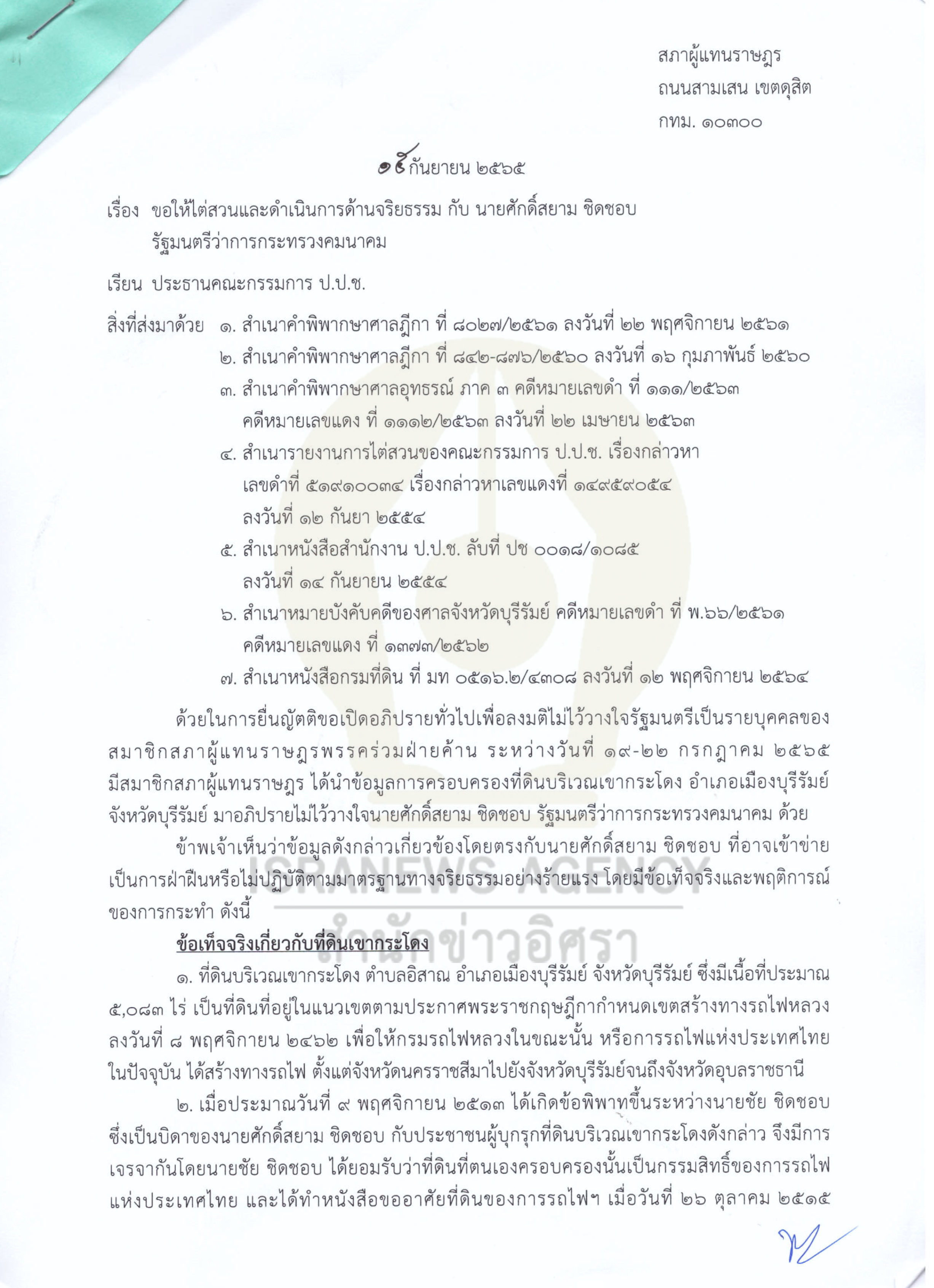 และส่วนที่ 2 การดำเนินคดีกรณีฝ่าฝืนหรือไม่ปฏิบัติตามมาตรฐานทางจริยธรรมอย่างร้ายแรง มาตรา 87 แห่งพ.ร.บ.ประกอบรัฐธรรมนูญว่าด้วยการป้องกันและปราบปรามการทุจริต พ.ศ.2561 ต่อไป พร้อมกันนี้ ข้าพเจ้าได้ส่งเอกสารหลักฐานเบื้องต้นมาเพื่อประกอบการพิจารณาด้วยแล้ว” หนังสือเรื่อง ขอให้ไต่สวนและดำเนินการด้านจริยธรรมกับนายศักดิ์สยาม ชิดชอบ รมว.คมนาคม ถึงประธาน ป.ป.ช. ลงวันที่ 15 ก.ย.2565 ระบุ