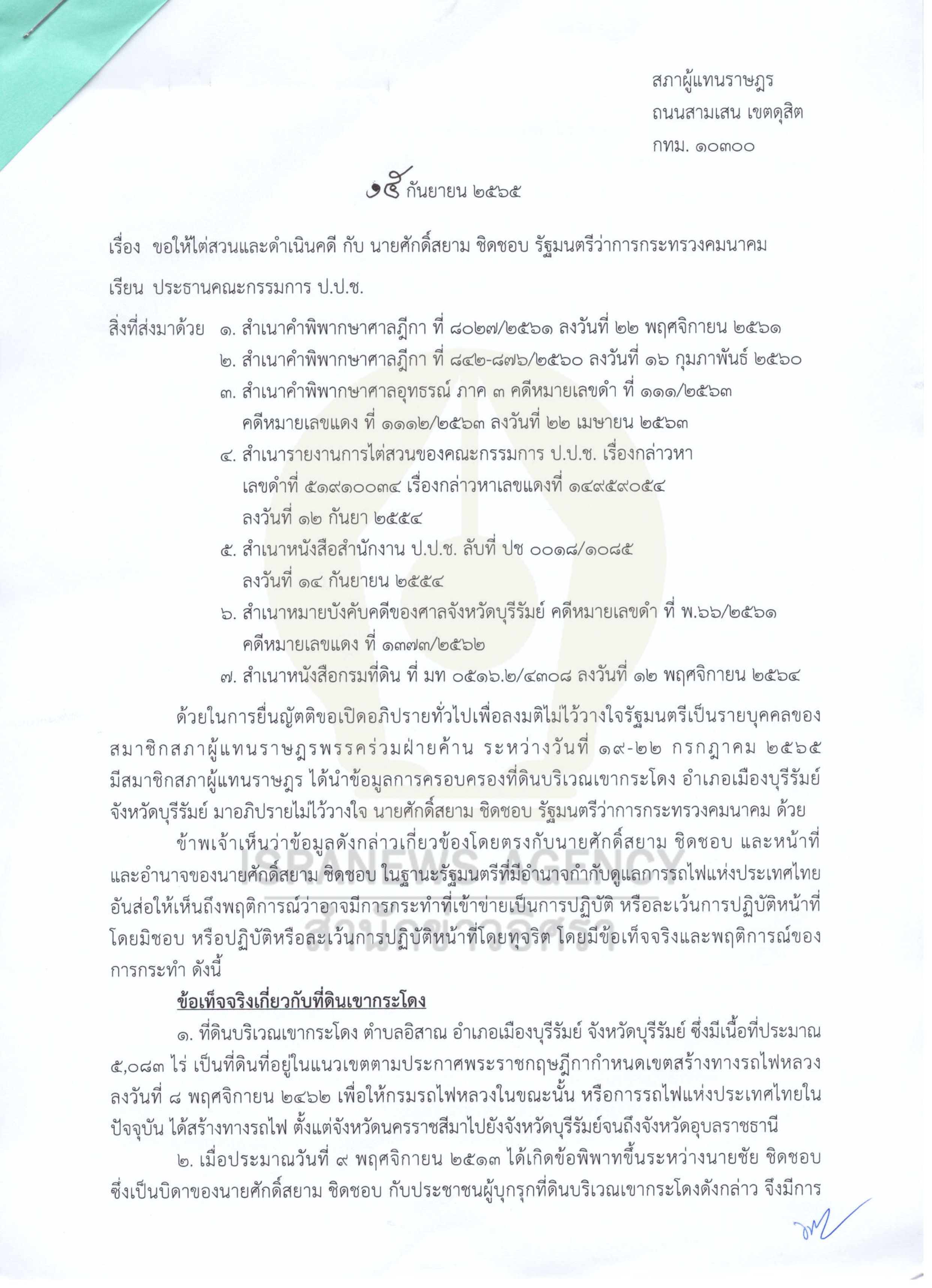 หนังสือฉบับที่ 1 ขอให้ไต่สวนและดำเนินคดีนายศักดิ์สยาม ชิดชอบ รมว.คมนาคม