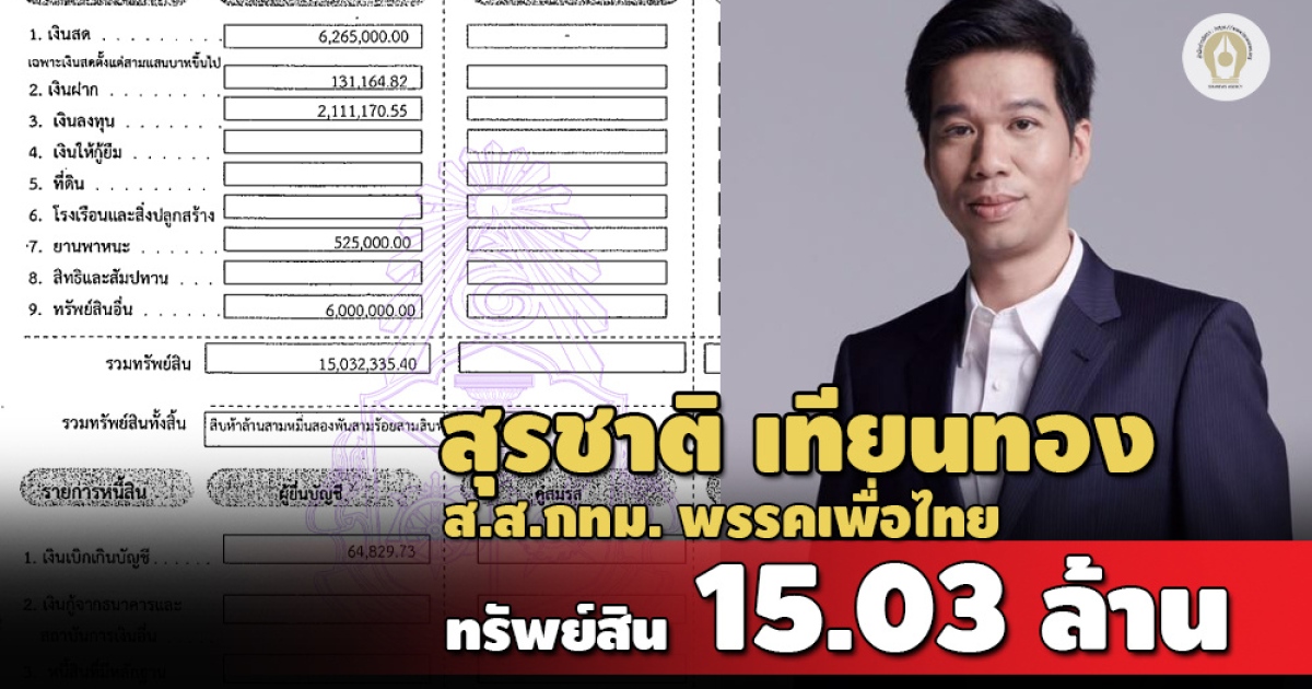นายสุรชาติ เทียนทอง อายุ 43 ปี แจ้งมีทรัพย์สิน 15,032,335.40 บาท จากเงินสด 6,265,000 บาท แจ้งว่าเพื่อใช้จ่ายหมุนเวียนในครอบครัว เงินฝาก 8 บัญชี 131,164.82 บาท เงินลงทุน 2 รายการได้มาเมื่อ 25 พ.ค.2565 มูลค่า 2,111,170.55 บาท แบ่งเป็น กองทุนรวมระยะยาว 132,504.73 บาท และ หุ้น YNP 3,000,000 หน่วย มูลค่า 1,978,665.82 บาท ยานพาหนะเป็นรถยนต์ 2 คัน 525,000 บาท ทรัพย์สินอื่น 6,000,000 บาท มีหนี้สิน 64,829.73 บาท