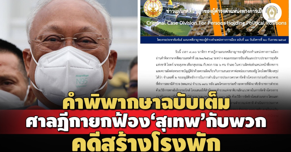 ศาลฎีกาแผนกคดีอาญาของผู้ดำรงตำแหน่งทางการเมือง อ่านคำพิพากษาคดีหมายเลขดำที่ อม.23/2564 ระหว่าง คณะกรรมการป้องกันและปราบปรามการทุจริตแห่งชาติ (ป.ป.ช.) โจทก์ นายสุเทพ เทือกสุบรรณ กับพวก รวม 6 คน จำเลย ในความผิดต่อตำแหน่งหน้าที่ราชการ และความผิดต่อ พ.ร.บ.ว่าด้วยความผิดเกี่ยวกับการเสนอราคาต่อหน่วยงานของรัฐ