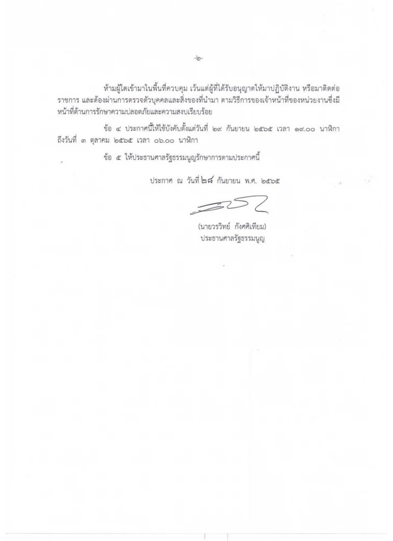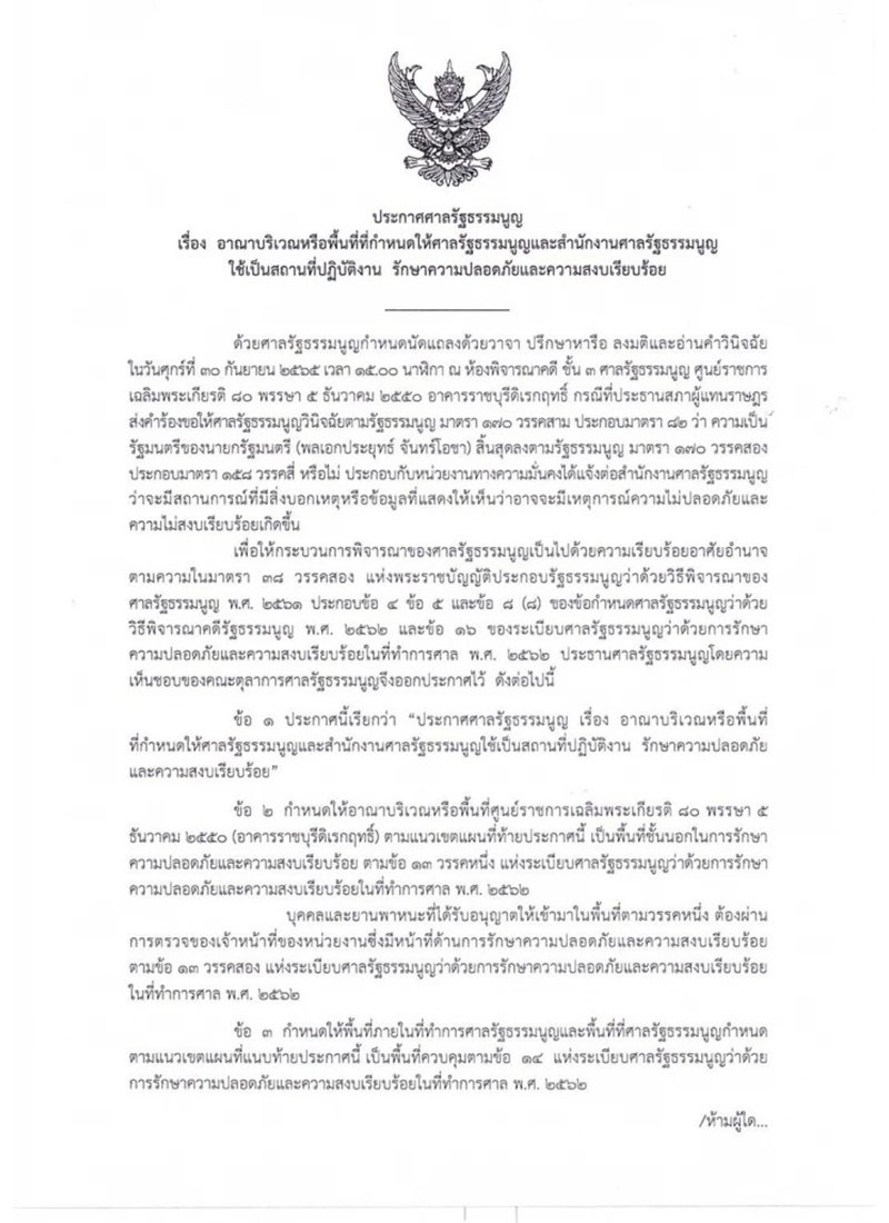 ทางหน่วยงานความมั่นคงได้แจ้งต่อสำนักงานศาลรัฐธรรมนูญ ว่า จะมีสถานการณ์ที่มีสิ่งบอกเหตุ หรือข้อมูลที่แสดงให้เห็นว่าอาจจะมีเหตุการณ์ความไม่ปลอดภัยและความไม่สงบเรียบร้อยเกิดขึ้น เพื่อให้กระบวนการเป็นไปด้วยความเรียบร้อย จึงออกประกาศกำหนดให้อาณาบริเวณ หรือพื้นที่ศูนย์ราชการเฉลิมพระเกียรติ อาคารราชบุรีดิเรกฤทธิ์ (อาคาร A) ตามแนวเขตเป็นพื้นที่ชั้นนอกในการรักษาความปลอดภัยและความสงบเรียบร้อย บุคคล และยานพาหนะที่ได้รับอนุญาตให้เข้ามาในพื้นที่ ต้องผ่านการตรวจของเจ้าหน้าที่ของหน่วยงาน และห้ามผู้ใดเข้ามาในพื้นที่ควบคุม เว้นแต่ผู้ที่ได้รับอนุญาตให้เข้ามาปฏิบัติงานหรือมาติดต่อราชการ และต้องผ่านการตรวจตัวบุคคลและสิ่งของที่นำมา ตามวิธีการของหน่วยงานซึ่งมีหน้าที่รักษาความปลอดภัยและคงามสงบเรียบร้อย มีผลใช้บังคับตั้งแต่วันที่ 29 กันยายน เวลา 19.00 น. ถึง วันที่ 3 ตุลาคม เวลา 06.00 น.