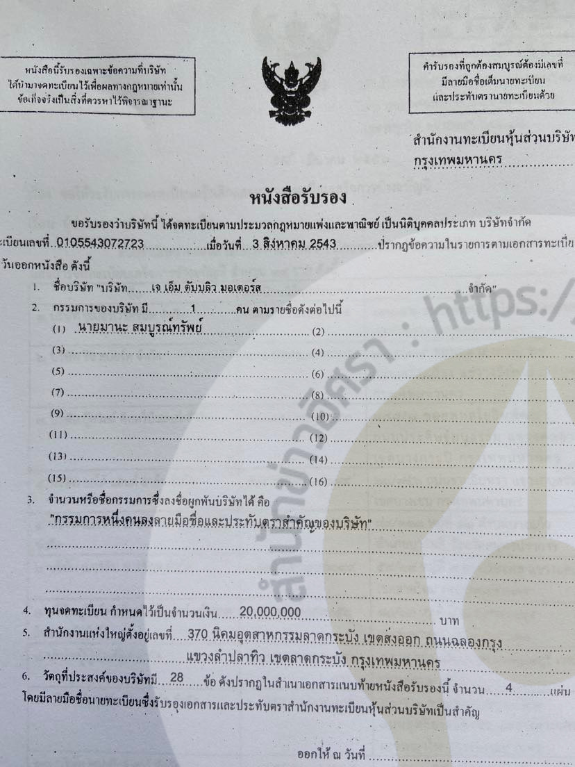 จากการตรวจสอบกับกรมพัฒนาธุรกิจการค้าพบว่า บริษัท เจ เอ็ม ดับบลิว มอเตอร์ส จำกัด จดทะเบียนวันที่ 3 สิงหาคม 2543 ทุน 3 ล้านบาท ที่ตั้งเลขที่ 370 ถนนฉลองกรุง แขวงลำปลาทิว เขตลาดกระบัง จังหวัดกรุงเทพมหานคร (ที่ตั้งสำนักงาน สาขา เลขที่ 244 หมู่ 4 ตำบลบ้านสร้าง อำเภอบ้านสร้าง จังหวัดปราจีนบุรี) นายจิตรเกษม จีระแพทย์ กรรมการจดทะเบียนก่อตั้ง ต่อมาจดทะเบียนเพิ่มทุนและเป็นแปลงกรรมการหลายครั้ง