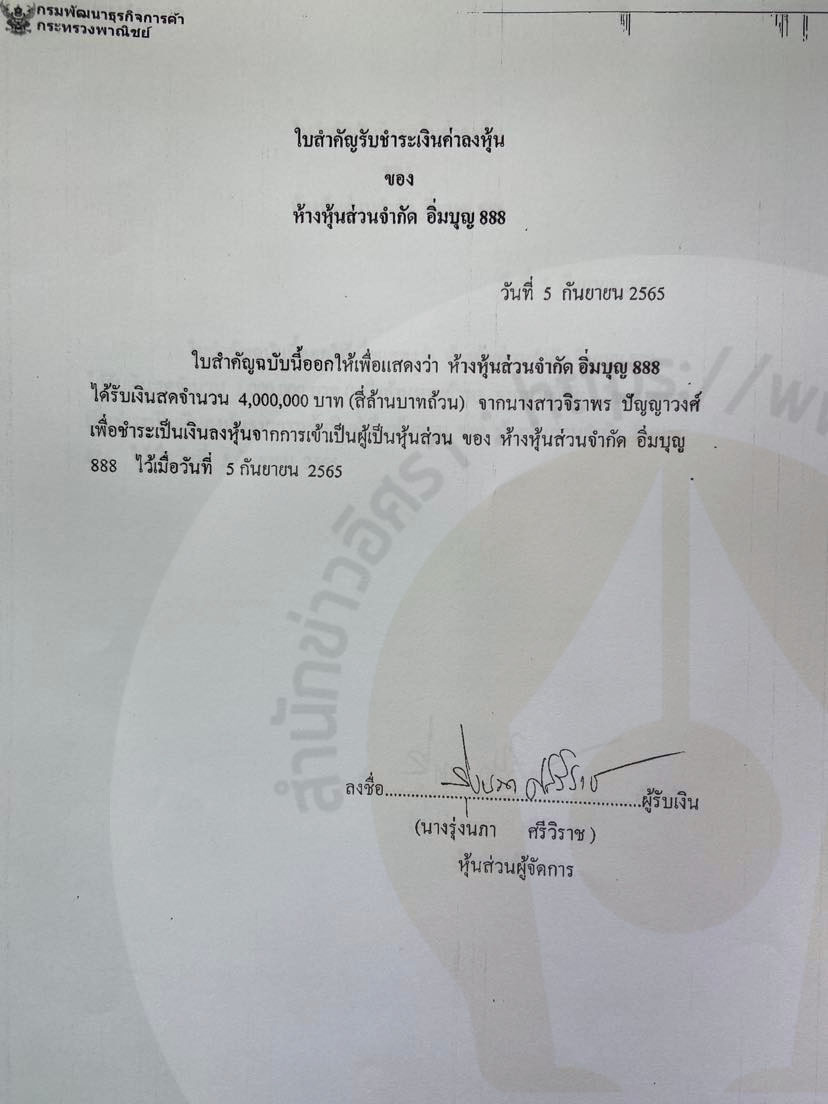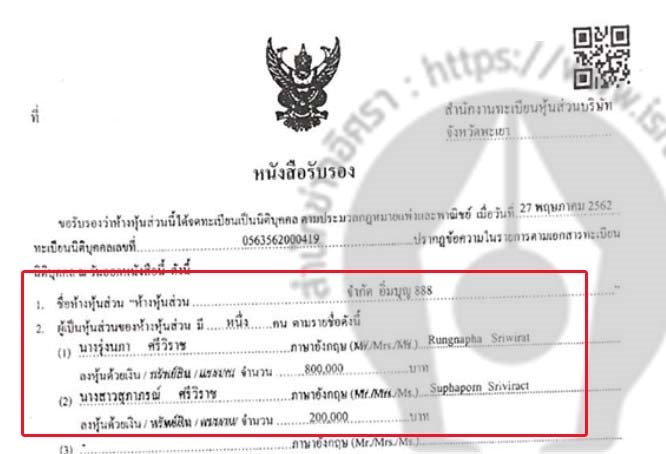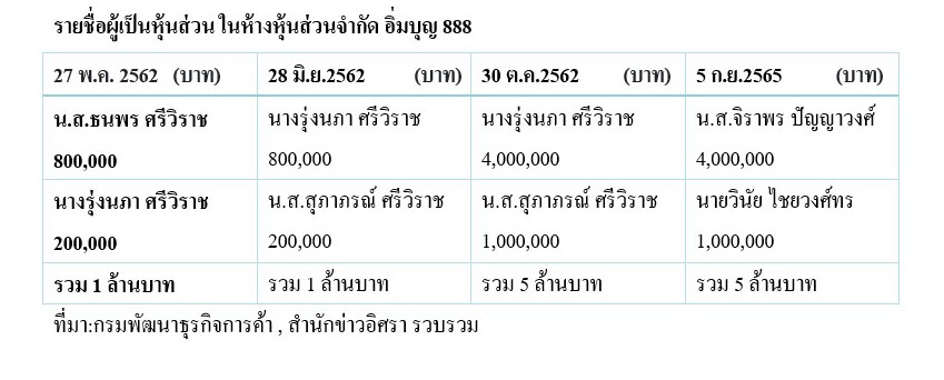 ทั้งนี้ ห้างหุ้นส่วนจำกัด อิ่มบุญ 888 จดทะเบียนวันที่ 27 พ.ค. 2562 ทุน 1 ล้านบาท แจ้งรายละเอียดวัตถุที่ประสงค์ 21 ข้อ ในแบบ สสช.1 ระบุวัตถุประสงค์ 2 ข้อ คือ รับเหมาก่อสร้างทุกชนิด และขายวัสดุก่อสร้างทุกชนิด ที่ตั้งเลขที่ 888 หมู่ที่ 11 ต.บ้านต๋อม อ.เมืองพะเยา จ.พะเยา มีผู้ถือหุ้น 2 คนคือ น.ส.ธนพร ศรีวิราช ลงหุ้นด้วยเงิน 800,000 บาท นางรุ่งนภา ศรีวิราช 200,000 บาท น.ส.ธนพร ศรีวิราช มีตำแหน่ง หุ้นส่วนผู้จัดการ