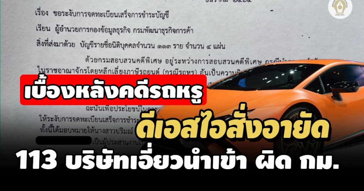 เบื้องหลังคดีนำเข้ารถหรู! 113 บริษัทเกี่ยวพัน รองอธิบดีดีเอสไอส่งหนังสือกรมพัฒนาฯระงับจดทะเบียนเสร็จการชำระบัญชี ยังสอบสวนไม่แล้วเสร็จ มีชื่อ บ.เอ็ม ดับบลิว มอเตอร์ส ‘เสี่ยมานะ’ 1 ใน 4 รายคดีโจรกรรมจากสหราชอาณาจักรเข้ามาโดยมิชอบด้วย