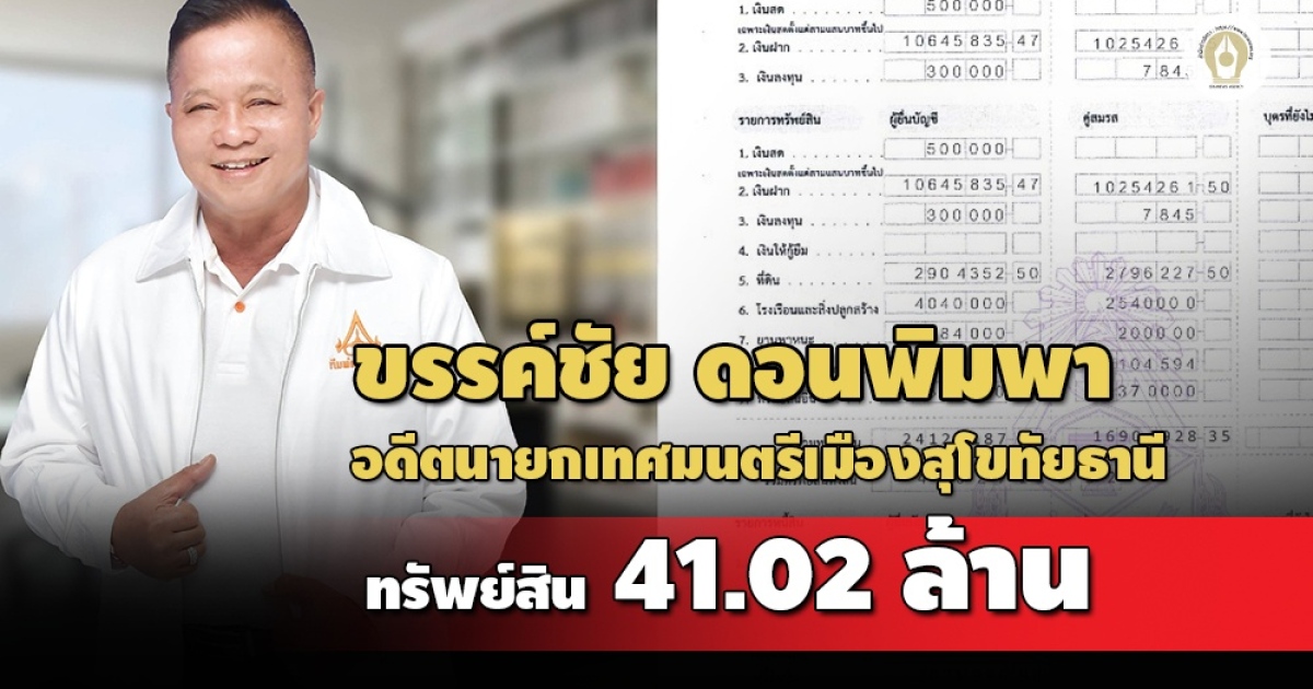 เปิดทรัพย์สิน ‘ขรรค์ชัย ดอนพิมพา’ อดีตนายกเมืองสุโขทัยธานี ถือครองทรัพย์สินร่วมคู่สมรส 41.02 ล้าน เงินฝาก 13 บัญชี 10.64 ล้าน ที่ดินในสุโขทัย-พิษณุโลก 21 แปลง 2.9 ล้าน คู่สมรสแจงมีสิทธิและสัมปทาน แต่ไม่ระบุรายละเอียดเคยถูกศาลฎีกาฯสั่งจำคุก 1 เดือน ปรับ 4 พันบาท คดียื่นบัญชีฯเท็จ ป.ป.ช. รอลงโทษ 1 ปี
