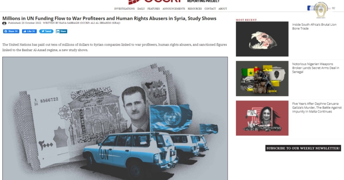 โดยสำนักข่าวเครือข่ายผู้สื่อข่าวองค์กรอาชญากรรมและการทุจริต (OCCRP) ได้มีการรายงานข่าวว่าพบข้อมูลว่าว่าสหประชาชาติได้มีการจ่ายเงินคิดเป็นจำนวนนับสิบล้านดอลลาร์สหรัฐฯ ให้กับบริษัทสัญชาติซีเรียหลายแห่ง ซึ่งมีประวัติการค้ากำไรกับสงคราม,การละเมิดสิทธิมนุษยชน และยังเป็นบริษัทที่ถูกคว่ำบาตรเนื่องจากว่ามีความเชื่อมโยงไปถึงระบอบเผด็จการของนายบาชาร์ อัล-อัสซาด