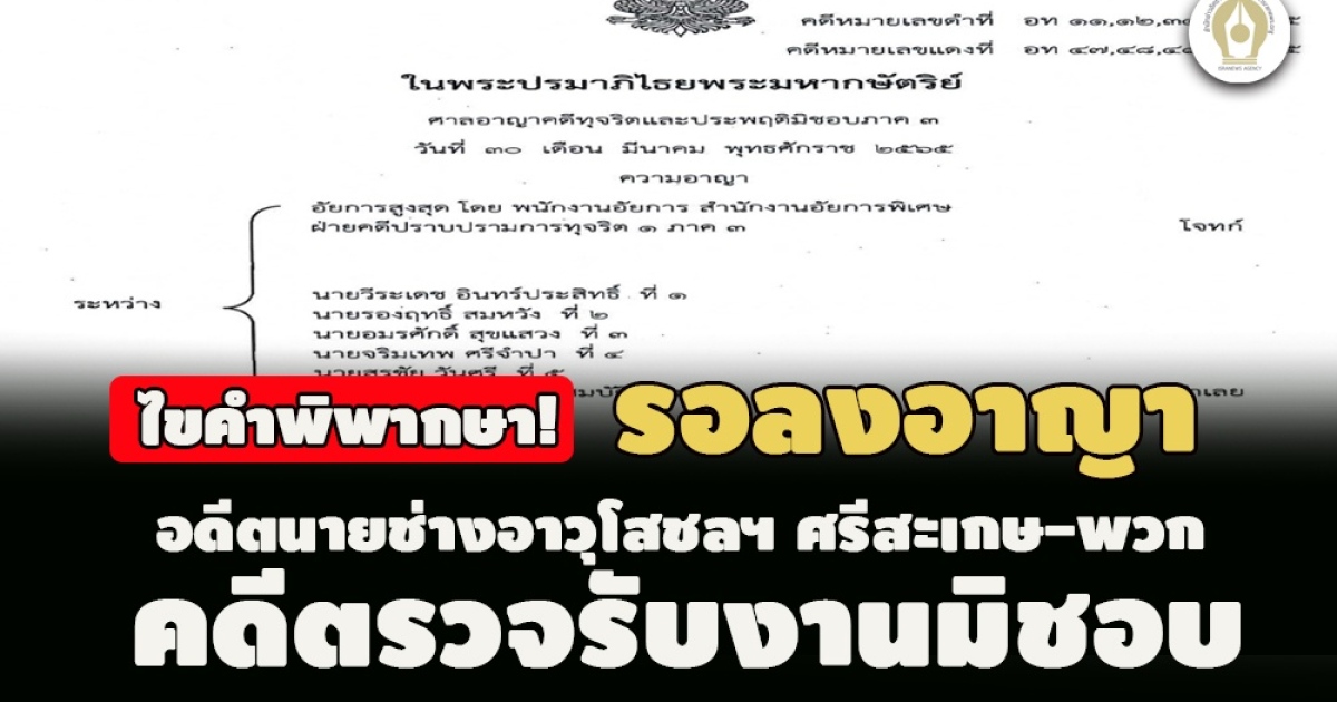 คือ บทสรุปคำพิพากษาศาลอาญาคดีทุจริตและประพฤติมิชอบ ภาค 3 เมื่อวันที่ 30 มีนาคม 2565 ที่ตัดสินคดีกล่าวหาข้าราชการเจ้าหน้าที่โครงการชลประทานศรีสะเกษ จำนวน 6 ราย กรณีตรวจรับงานโครงการจ้างเหมาก่อสร้างสถานีสูบน้ำด้วยไฟฟ้าพร้อมระบบส่งน้ำบ้านขนุน 2 ตำบลขนุน อำเภอกันทรลักษณ์ จังหวัดศรีสะเกษ ว่า ถูกต้องควบถ้วนและเบิกจ่ายเงินแก่ผู้รับจ้างทั้งที่งานก่อสร้างไม่ถูกต้องครบถ้วนตามสัญญา