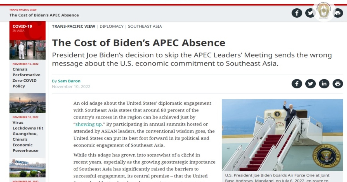 เรียบเรียงจาก:https://thediplomat.com/2022/11/the-cost-of-bidens-apec-absence/