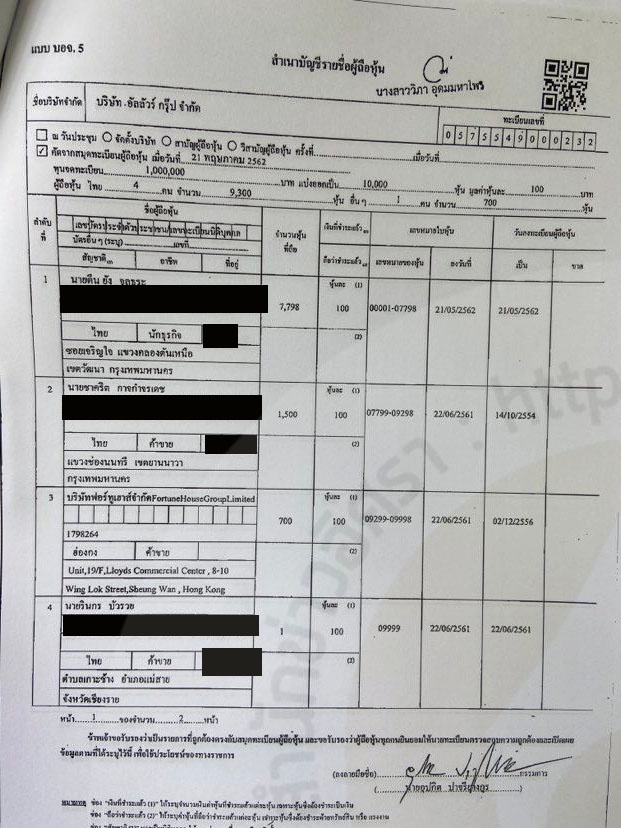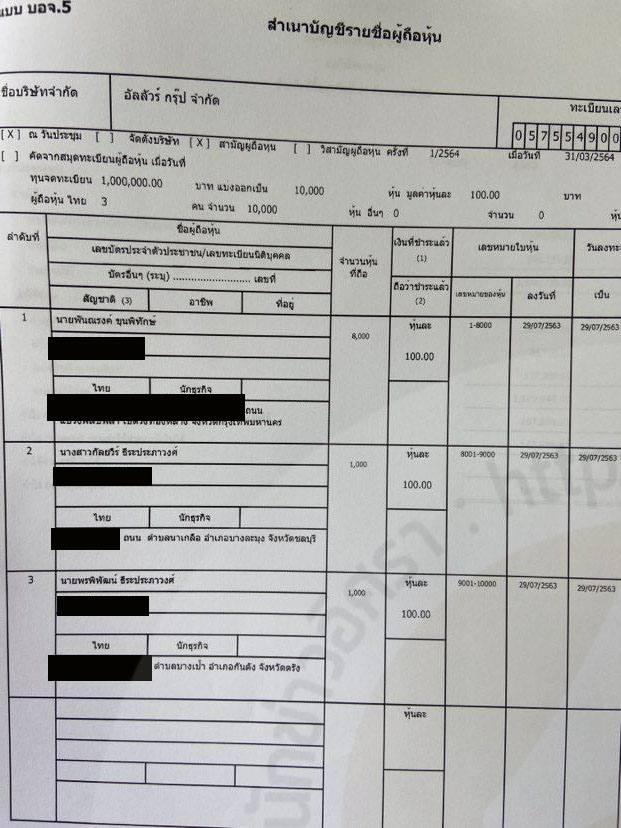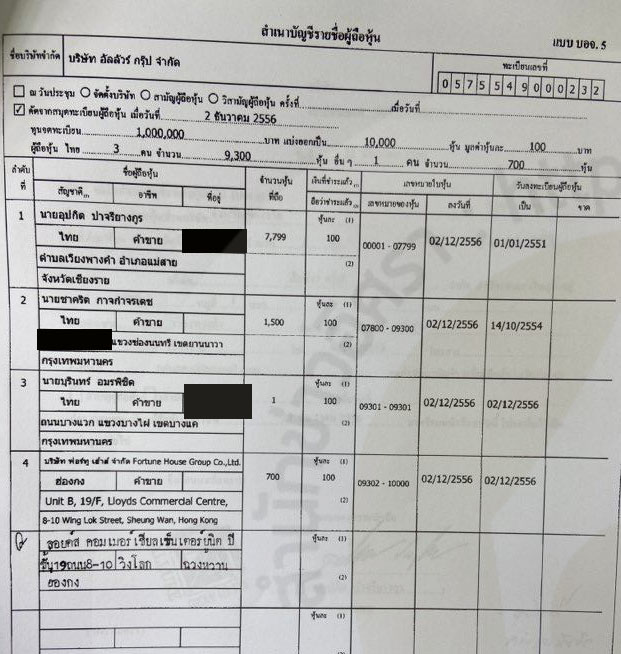 @ ผู้ถือหุ้น บริษัท อัลลัวร์ กรุ๊ป จำกัด ตั้งแต่ก่อตั้ง-เม.ย.2565