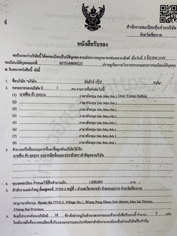 24 พ.ค.2562 จดทะเบียนเปลี่ยนแปลง นายดีน ยัง จุลกะ อายุ 35 ปี อยู่บ้านในซอยเจริญใจ แขวงคลองตันเหนือ เขตวัฒนา กรุงเทพฯ เป็นกรรมการ (นายอุปกิต ออก)