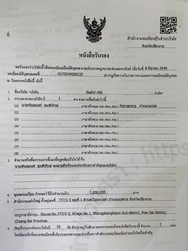 9 ก.พ.2564 จดทะเบียนแก้ไขสำนักงานที่ตั้งเลขที่ 601 หมู่ที่ 9 ต.เวียงพางคำ อ.แม่สาย จ.เชียงราย (ที่ตั้งปัจจุบัน )