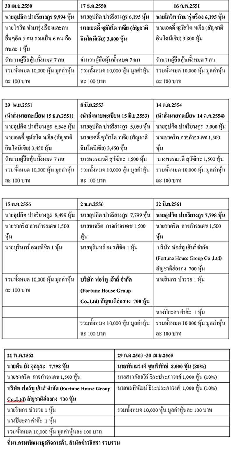 จากข้อมูลเห็นได้ว่า นิติบุคคลรายนี้ นายอุปกิต ปาจรียางกูร ถือหุ้นใหญ่ในช่วงก่อตั้ง ต่อมา 16 ก.พ.2551 นายอุปกิต โอนหุ้นให้ นายโกวิท ทำมารุ่งเรือง และกลับมาถือหุ้นอีกครั้งช่วงปลายเดือน พ.ย.2551 และถือหุ้นใหญ่เรื่อยมา ต่อมาช่วงเดือน พ.ค.2562 โอนให้ นายดีน ยัง จุลธุระ หลังจากนั้น นายดีน โอนต่อให้นายพันณรงค์ ขุนพิทักษ์ เมื่อเดือน ก.ค.2563