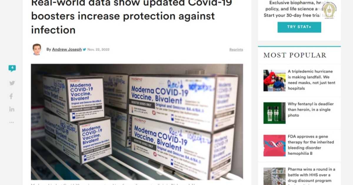 ล่าสุดมีรายงานข่าวจากสำนักข่าว STAT News ของสหรัฐอเมริกา ซึ่งเน้นการรายงานข่าวทางด้านสถิติ ได้รายงานข่าวว่าการฉีดวัคซีนบูสเตอร์เพื่อป้องกันโควิดนั้นยังคงจำเป็นอยู่ ไม่ว่าจะเป็นวัคซีนแบบที่อัปเดตแล้วหรือว่าวัคซีนแบบดั้งเดิมก็ตาม และยังได้มีการเผยข้อมูลประสิทธิภาพของวัคซีนรุ่นใหม่