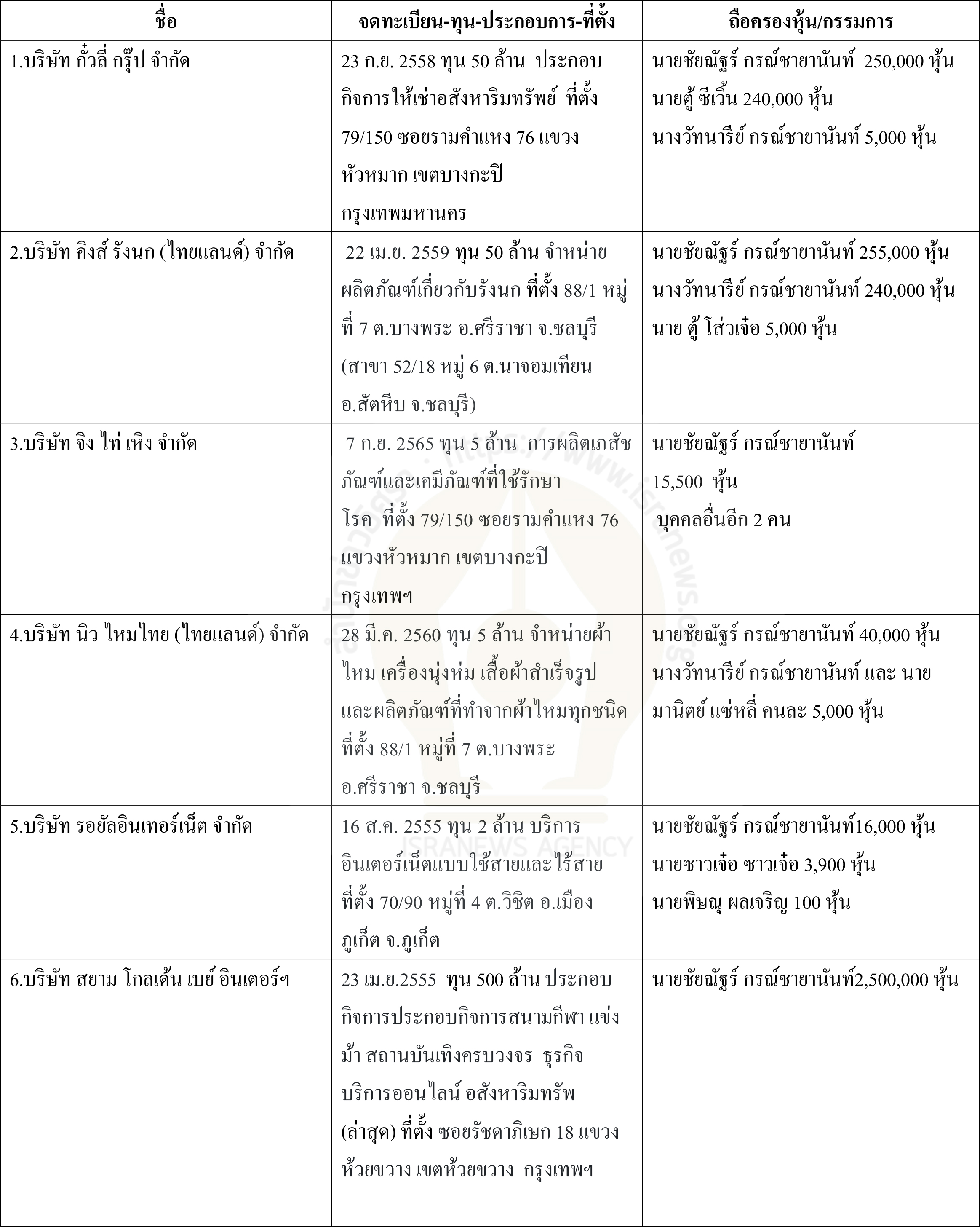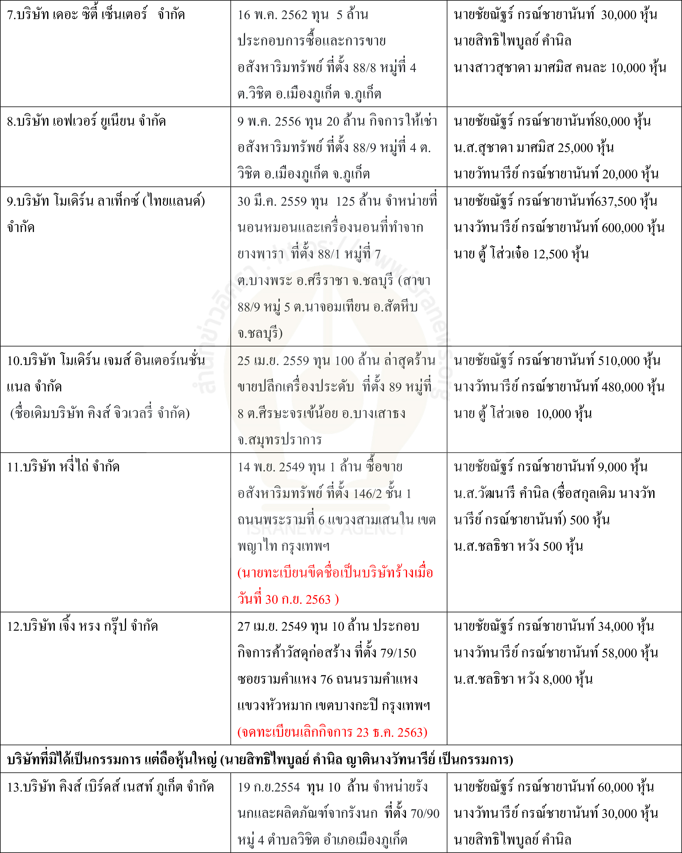 1.บริษัทที่นายชัยณัฐร์ มีชื่อเป็นกรรมการและถือหุ้นใหญ่ 12 บริษัท ในจำนวนนี้เลิกกิจการแล้ว 2 แห่ง