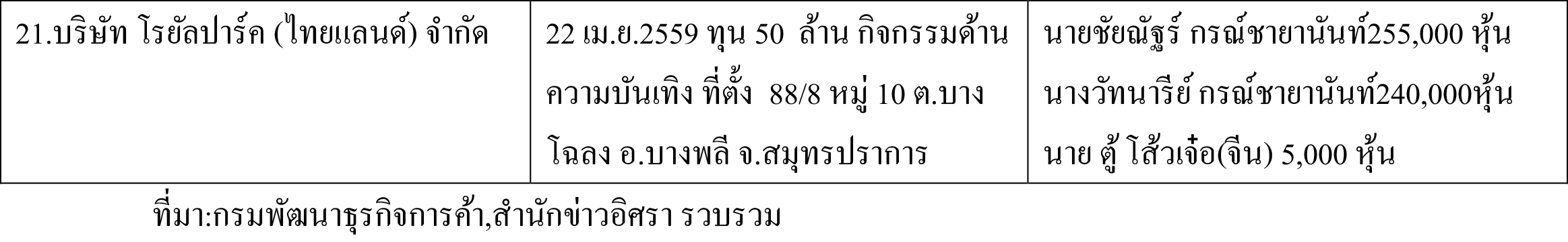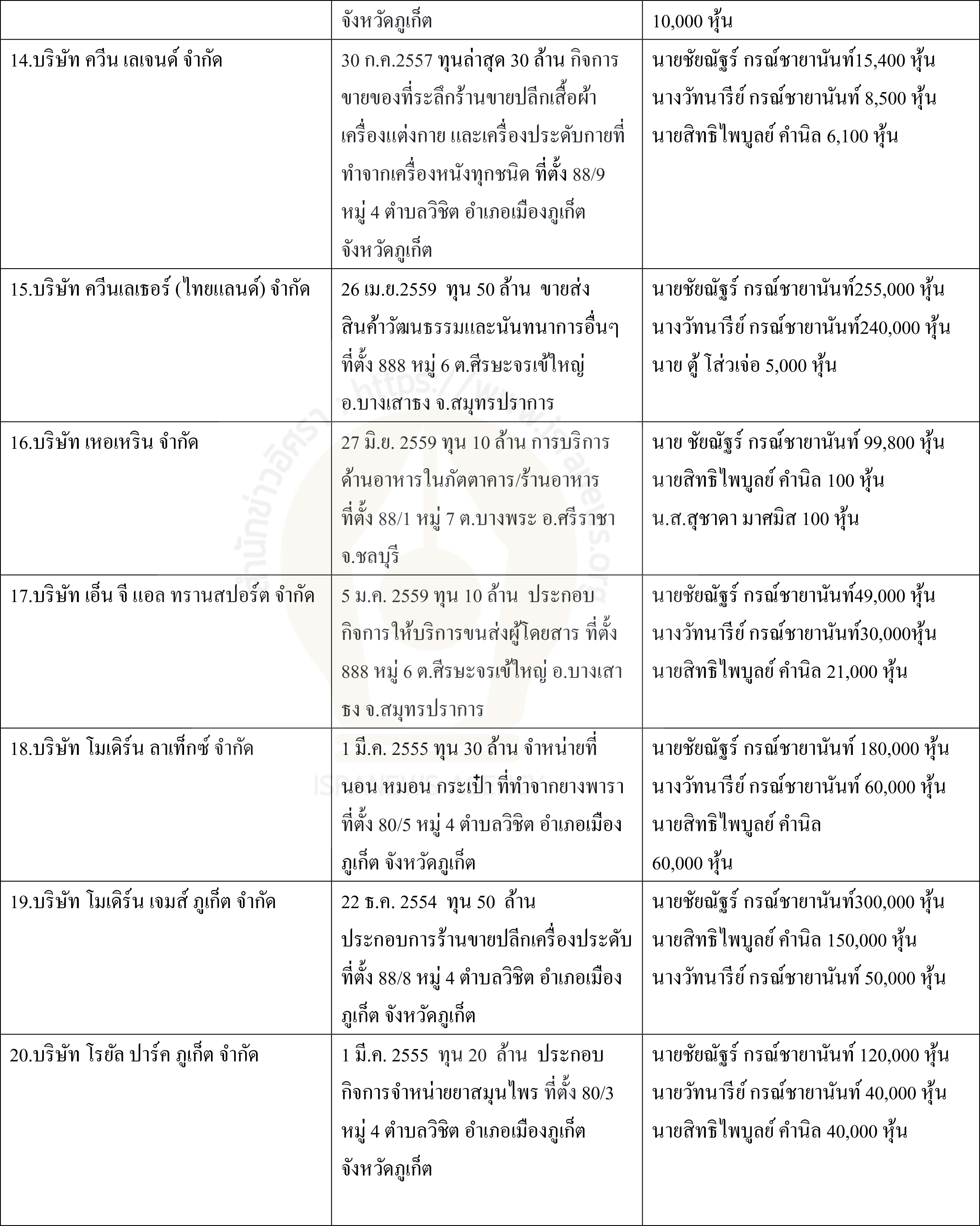3. มีสำนักที่ตั้งปัจจุบันอยู่ในกรุงเทพฯ 5 บริษัท จ.สมุทรปราการ 4 บริษัท จ.ภูเก็ต 8 บริษัท และ จ.ชลบุรี 4 บริษัท
