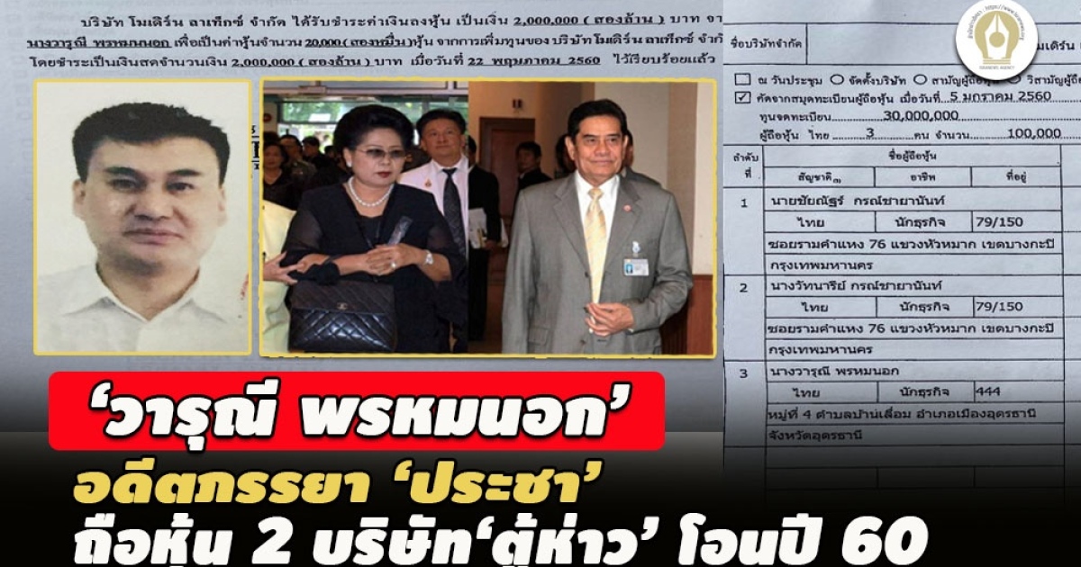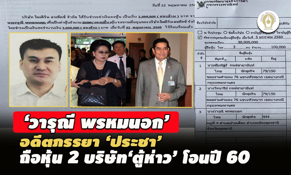 ไม่ใช่แค่ลูกสาว-เมียอดีต ส.ส.อุดรธานี! พบชื่อ ‘วารุณี พรหมนอก’ อดีตภริยา ‘ประชา’รองนายกฯ ร่วมธุรกิจ ‘ตู้ห่าว’ 2 บริษัท 150,000 หุ้น 15 ล้าน ก่อนโอนให้คนใกล้ชิดเสี่ยทุนจีนปี 60