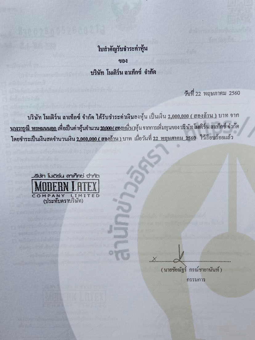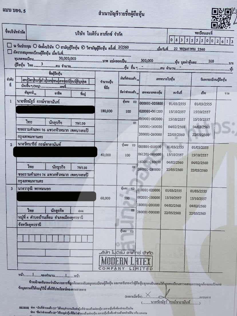 ทั้งนี้ บริษัท โมเดิร์น ลาเท็กซ์ จำกัด จดทะเบียนวันที่ 1 มี.ค. 2555 ทุนเริ่มแรก 2 ล้านบาท ล่าสุด 30 ล้าน จำหน่ายที่นอน หมอน กระเป๋า ที่ทำจากยางพารา ที่ตั้ง 80/5 หมู่ 4 ตำบลวิชิต อำเภอเมืองภูเก็ต จังหวัดภูเก็ต ผู้ถือหุ้นล่าสุด นายชัยณัฐร์ กรณ์ชายานันท์ 180,000 หุ้น นางวัทนารีย์ กรณ์ชายานันท์ 60,000 หุ้น และนายสิทธิไพบูลย์ คำนิล 60,000 หุ้น รวมทั้งหมด 300,000 หุ้น มูลค่าหุ้นละ 100 บาท