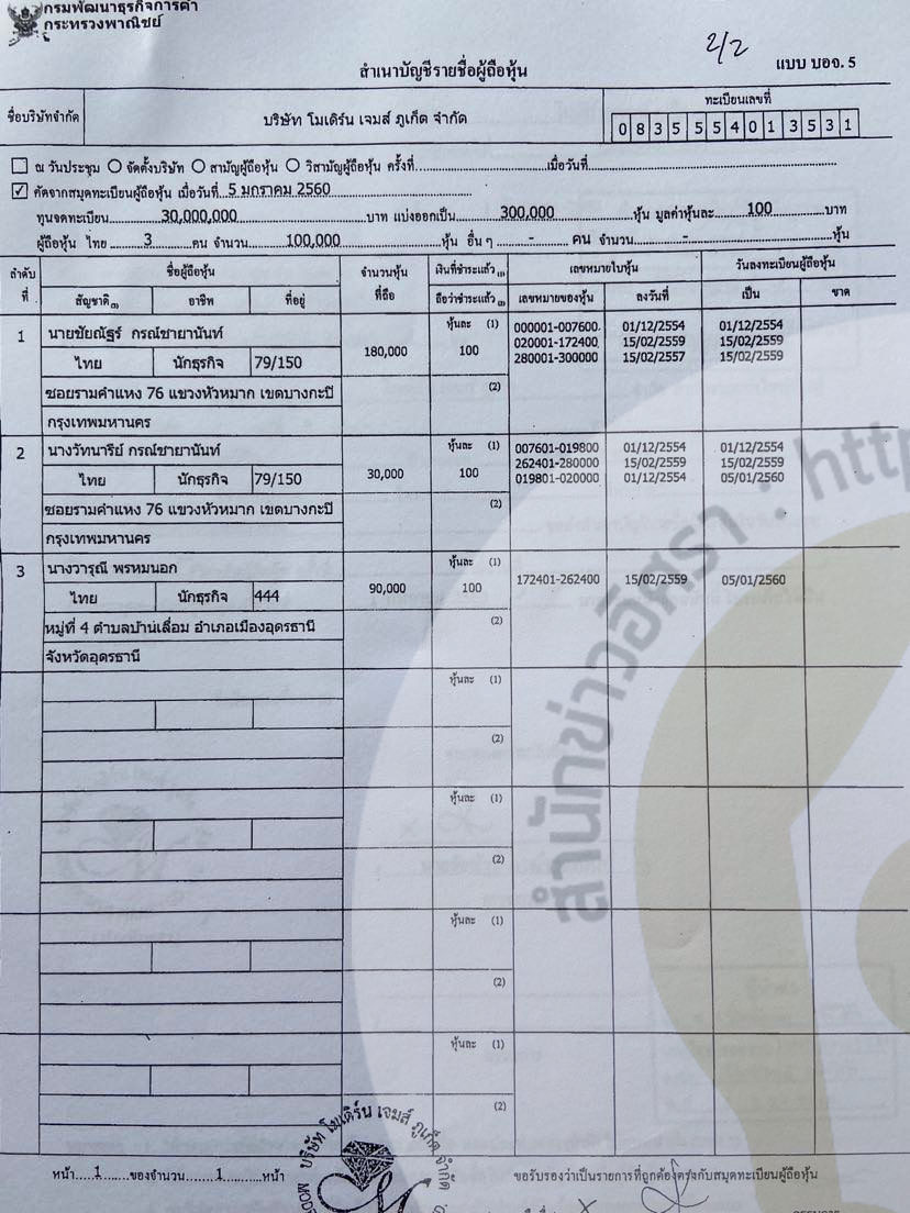 2.บริษัท โมเดิร์น เจมส์ ภูเก็ต จำกัด จำนวน 90,000 หุ้น เมื่อวันที่ 5 ม.ค.2560 ก่อนโอนให้นายสิทธิไพบูลย์ คำนิล เมื่อ 1 ก.ย.2560 (ดูเอกสาร)