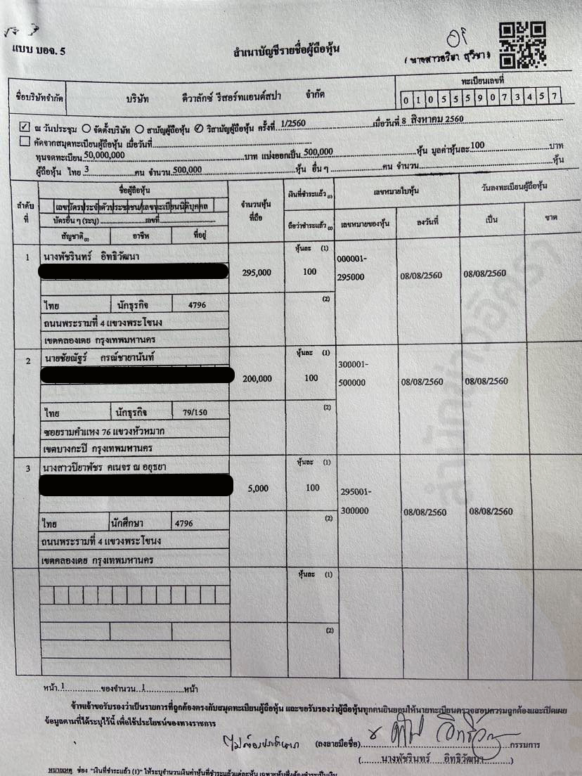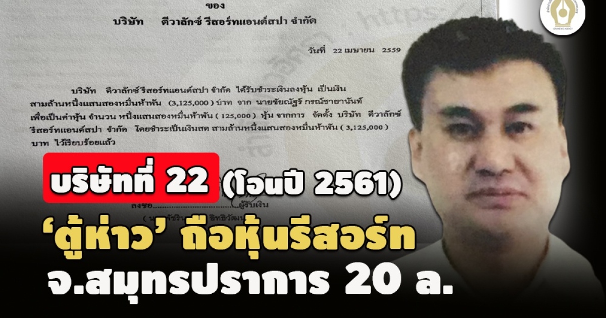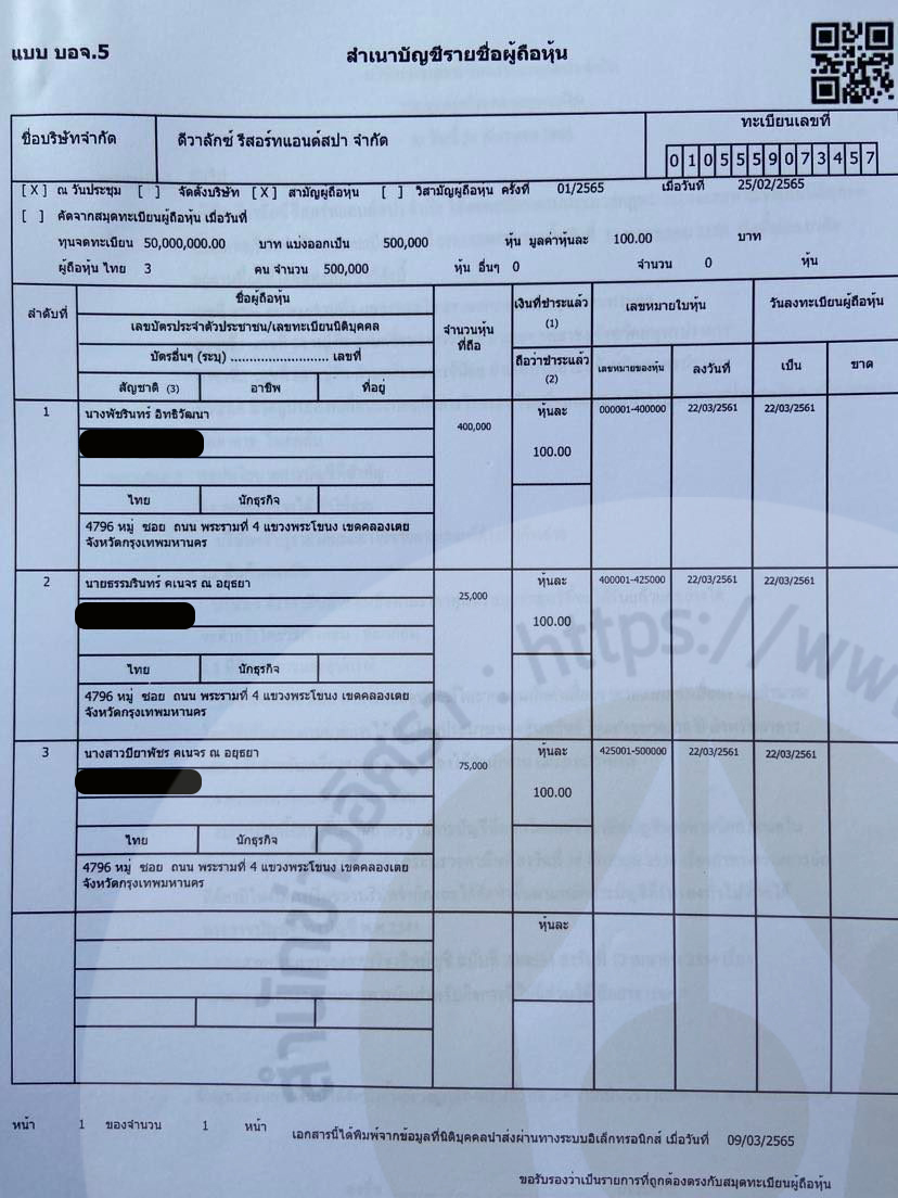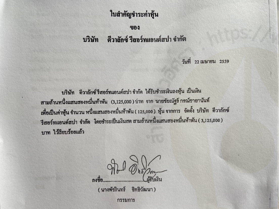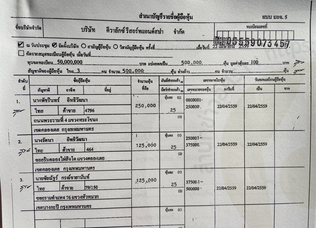 ไม่ใช่แค่ 21 บริษัท 1,133 ล้าน ! พบข้อมูล ‘ตู้ห่าว-ชัยณัฐร์ กรณ์ชายานันท์’ ทุนชาวจีน ร่วมสุภาพสตรี ‘พัชรินทร์ อิทธิวัฒนา’ ก่อตั้ง ดีวาลักซ์ รีสอร์ทแอนด์สปา อ.บางสำเธา จ.สมุทรปราการ ถือ 200,000 หุ้น โอนต้นปี 2561