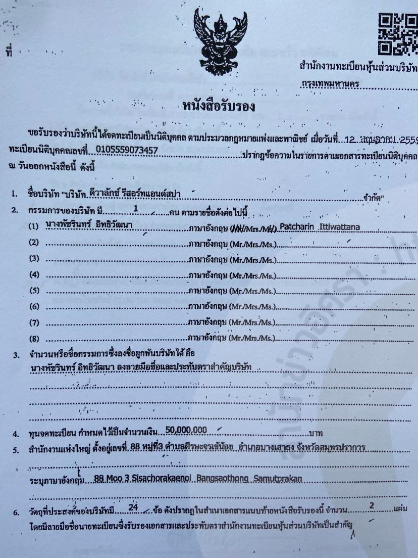 ทั้งนี้ บริษัท ดีวาลักซ์ รีสอร์ทแอนด์สปา จำกัด จดทะเบียนวันที่ 12 พ.ค. 2559 ทุน 50 ล้านบาท ประกอบการโรงแรม รีสอร์ทและห้องชุด ที่ตั้งเลขที่ 88 หมู่ 3 ตำบลศีรษะจรเข้น้อย อำเภอบางเสาธง จังหวัดสมุทรปราการ (สำนักงานสาขา ปราณณ์ สปา เลขที่ 54 หมู่ 3 ตำบลศีรษะจรเข้น้อย อำเภอบางเสาธง จังหวัดสมุทรปราการ) นางสาว พัชรินทร์ อิทธิวัฒนา เป็นกรรมการ