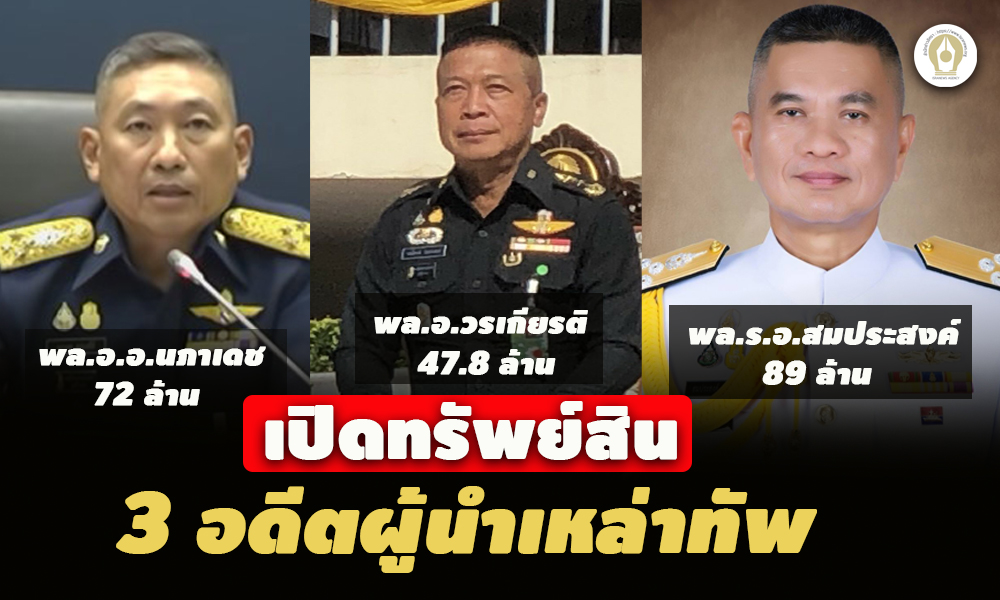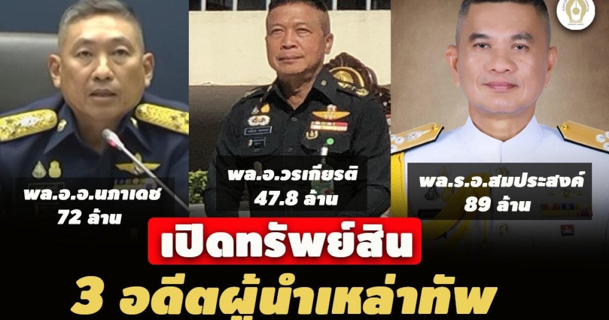 ป.ป.ช. เปิดทรัพย์สิน 3 อดีตผู้นำเหล่าทัพ หลังพ้นเก้าอี้ ส.ว. “พล.อ.อ.นภาเดช” รวย 72 ล้าน “พล.อ.วรเกียรติ” 47.8 ล้าน “พล.ร.อ.สมประสงค์” อู้ฟู่สุด 89 ล้าน คู่สมรสรับมรดก 10 ล้าน