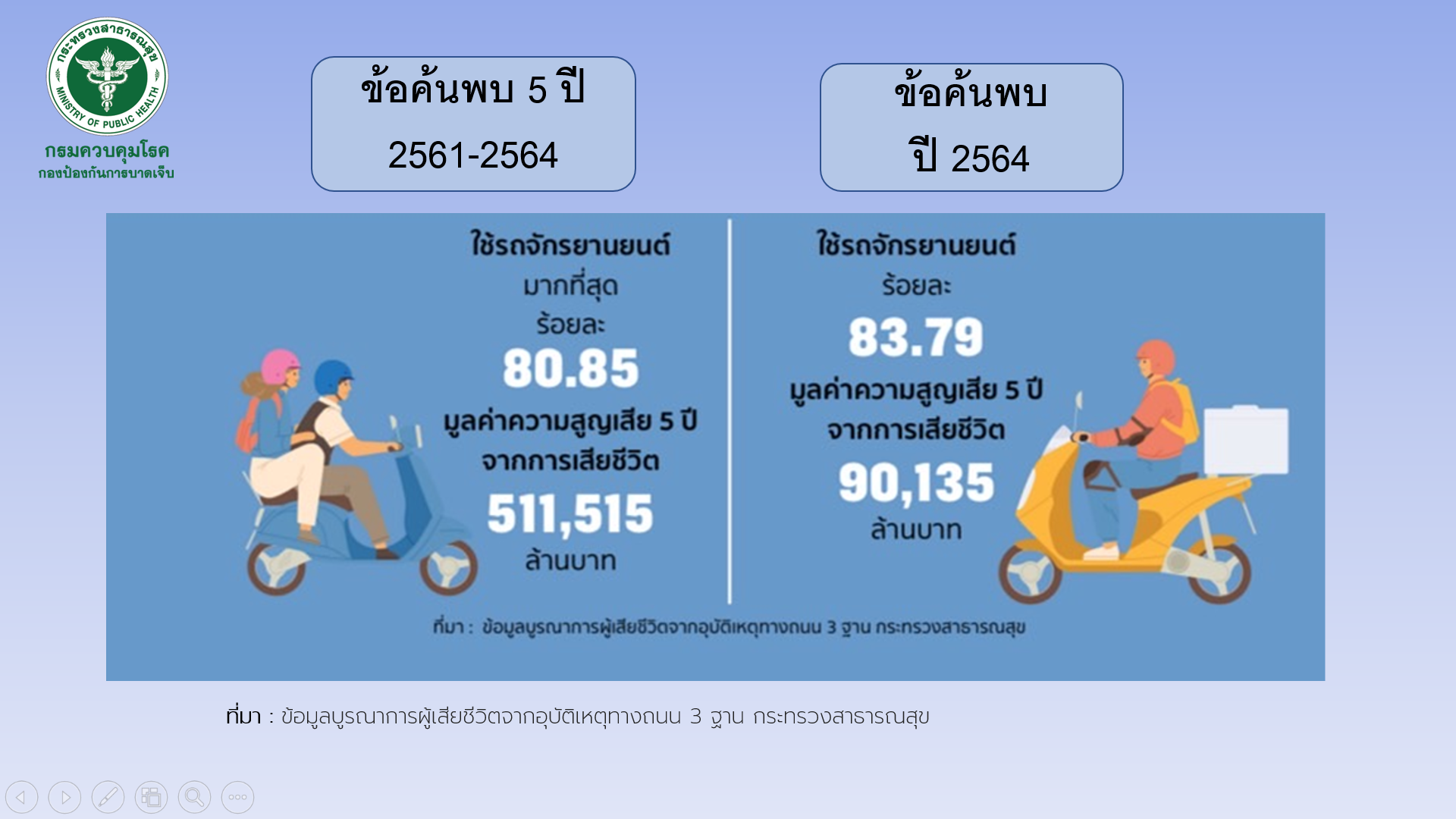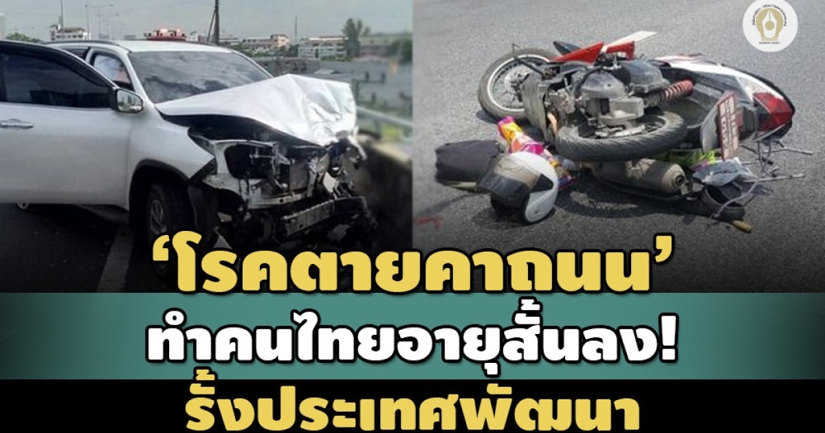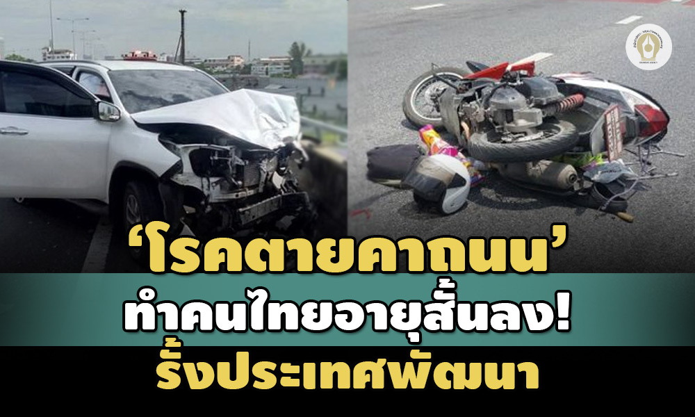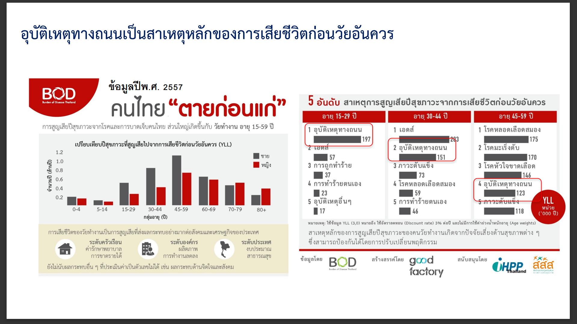 “…ในช่วง 5 ปีที่ผ่านมา ข้อมูล 3 ฐานคนไทยเสียชีวิตจากอุบัติเหตุทางถนนรวม 96,230 ราย เฉลี่ยปีละ 19,246 ราย เป็นชายมากกว่าหญิงในสัดส่วน 3.7 ต่อ 1 ส่วนใหญ่อยู่ในช่วงอายุ 15-19 ปี คิดเป็น 11.37% และ 20-24 ปี คิดเป็น 11.05% ในจำนวนนี้ 80% เกิดขึ้นในกลุ่มผู้ขับขี่จักรยานยนต์ ขณะที่ภาพรวมความสูญเสียทางเศรษฐกิจ รวมเฉียดล้านล้านบาท…”
