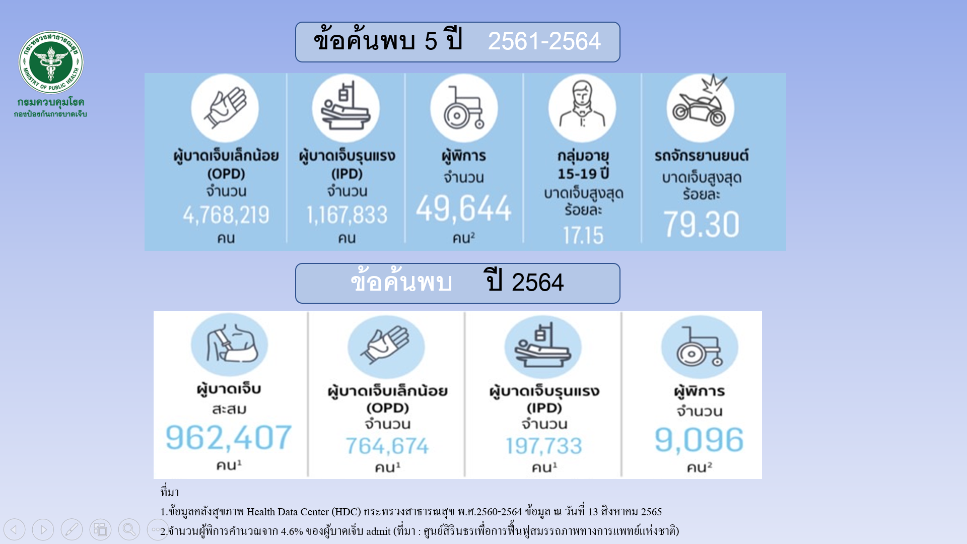 ทั้งนี้ สถานการณ์ปัจจุบันในประเทศไทย พบการสูญเสียของประชากรชายมีแนวโน้มสูงขึ้น ในขณะที่ผลกระทบที่เกิดจากประชากรหญิงมีแนวโน้มคงที่ ดังนี้
