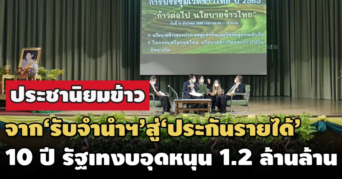 เมื่อวันที่ 14 ธ.ค.ที่ผ่านมา มูลนิธิข้าวไทยในพระบรมราชูปถัมภ์ จัดประชุมเวทีข้าวไทย ปี 2565 โดย รศ.สมพร อิศวิลานนท์ นักวิชาการอาวุโส สถาบันคลังสมองของชาติ ผู้เชี่ยวชาญเรื่องข้าว กล่าวในหัวข้อ ‘นโยบายข้าวไทยจากอดีตสู่ปัจจุบัน’ โดยระบุว่า หลังจากพรรคการเมืองใช้นโยบายประชานิยมเกทับกันในเรื่องข้าว ไม่ว่าจะเป็นโครงการรับจำนำ และการประกันรายได้ ส่งผลให้ในช่วง 10 ปีที่ผ่านมา รัฐบาลชุดต่างๆใช้เงินอุดหนุนราคาข้าวให้ชาวนารวม 1.2 ล้านล้านบาท