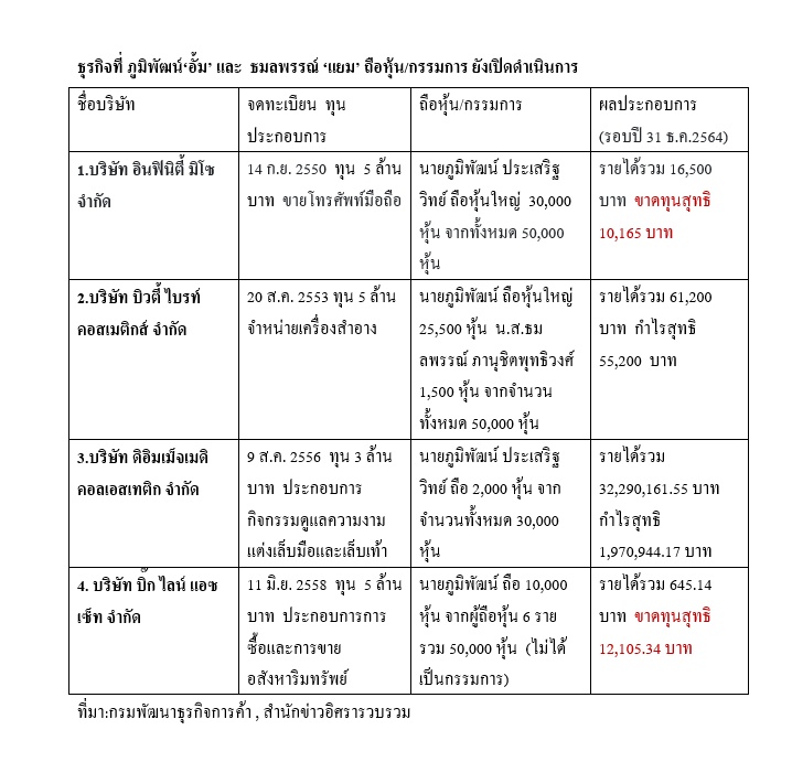 เปิดธุรกิจ ‘แยม- ธมลพรรณ์’อดีตนางเอกดังพร้อม‘อั๋น ภูมิพัฒน์’สามี ก่อนถูก ตร.รวบคดีเว็บพนันออนไลน์ แพร่สื่อลามก ฟอกเงิน! พบ นั่ง กก. ถือหุ้นรวม 8 บริษัท เลิกดำเนินการแล้ว 4 ยังเปิด 4 แห่ง แจ้งงบฯขาดทุนสะสม 3 แห่ง สปาเล็บรายได้มากสุด 32.2 ล. ขายโทรศัพท์ 16,500 บ. ส่วนอสังหาฯ 645.14 บ.