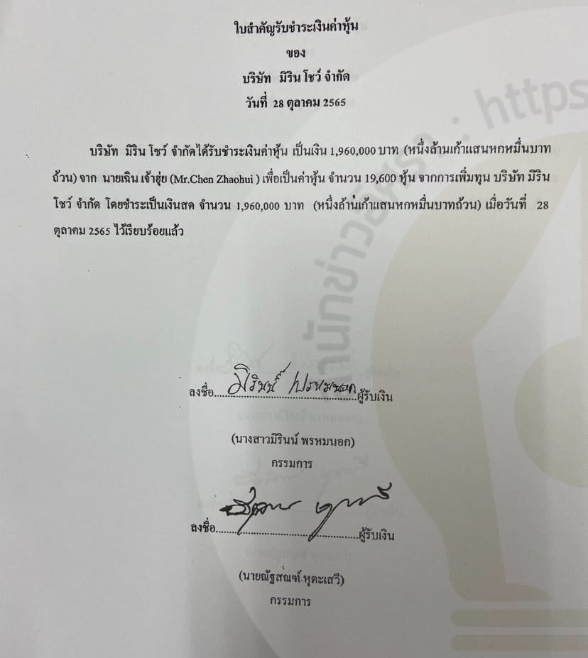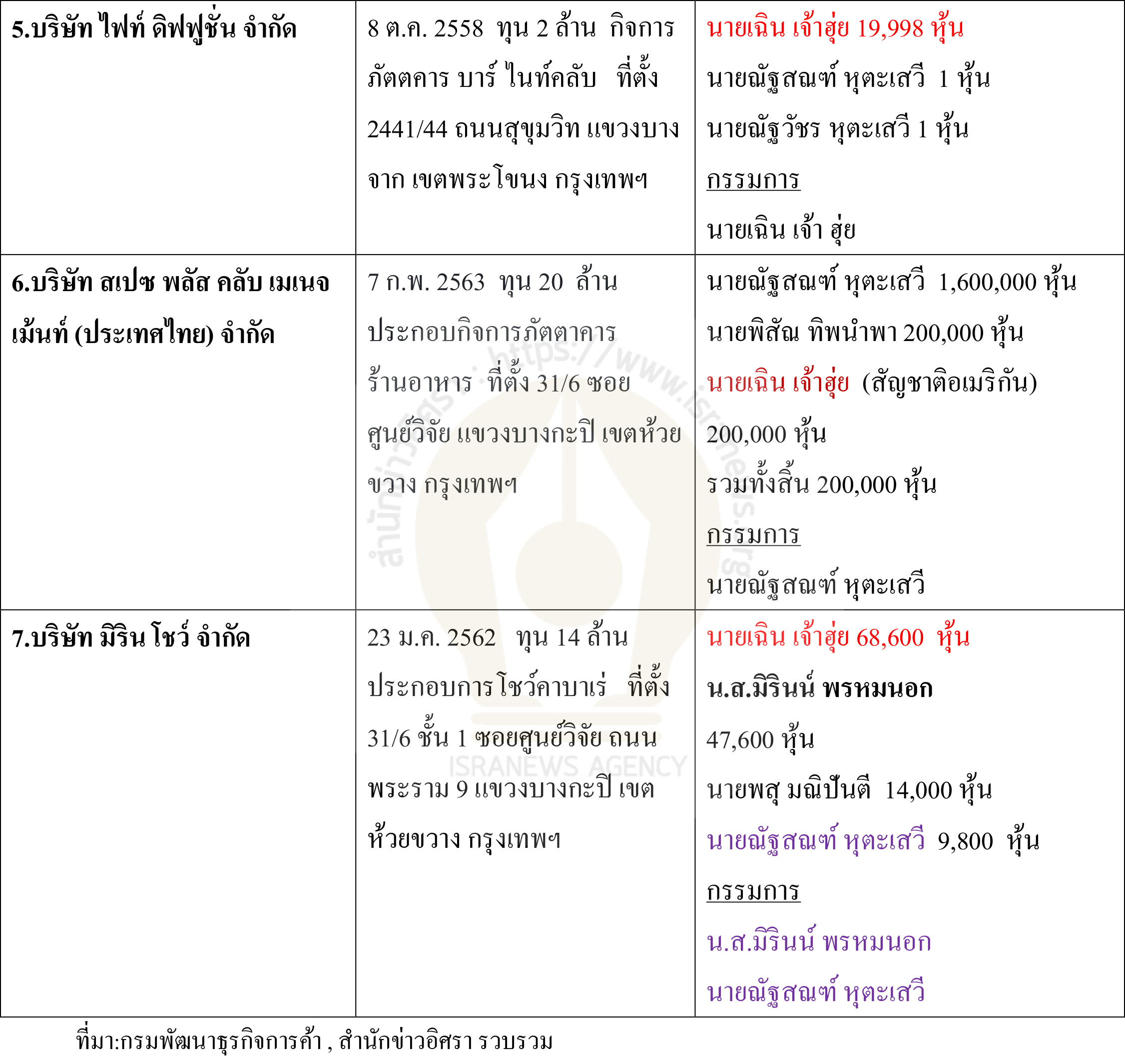 2.บริษัท มิริน โชว์ จำกัด จดทะเบียนวันที่ 23 ม.ค. 2562 ทุน 14 ล้านบาท ประกอบการโชว์คาบาเร่ ที่ตั้งเลขที่ 31/6 ชั้น 1 ซอยศูนย์วิจัย ถนนพระราม 9 แขวงบางกะปิ เขตห้วยขวาง กรุงเทพฯ นายเฉิน เจ้าฮุ่ย ถือ 68,600 หุ้น น.ส.มิรินน์ พรหมนอก 47,600 หุ้น นายพสุ มณิปันตี 14,000 หุ้น นายณัฐสณฑ์ หุตะเสวี 9,800 หุ้น น.ส.มิรินน์ พรหมนอก และ นายณัฐสณฑ์ หุตะเสวี เป็นกรรมการ (ดูตารางด้านล่างประกอบ)