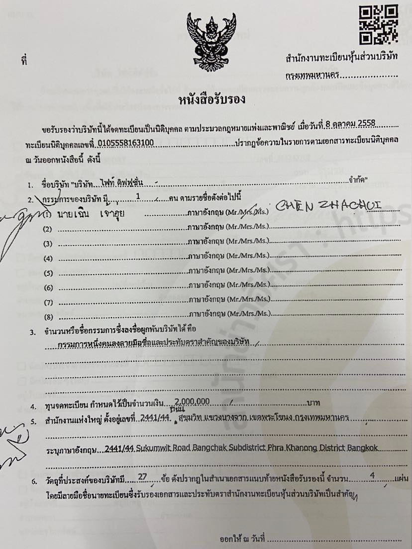 5.บริษัท ไฟท์ ดิฟฟูชั่น จำกัด จดทะเบียนวันที่ 8 ต.ค. 2558 ทุน 2 ล้านบาท กิจการภัตตคาร บาร์ ไนท์คลับ ที่ตั้งเขที่ 2441/44 ถนนสุขุมวิท แขวงบางจาก เขตพระโขนง กรุงเทพฯ นายเฉิน เจ้าฮุ่ย ถือ 19,998 หุ้น นายณัฐสณฑ์ หุตะเสวี นายณัฐวัชร หุตะเสวี คนละ หุ้น นายเฉิน เจ้าฮุ่ย เป็นกรรการ