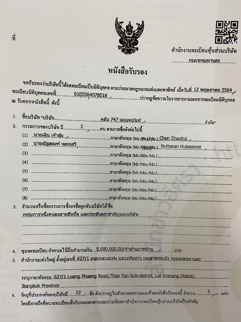 2.บริษัท คลับ 747 เมเนจเม้นท์ จำกัด จดทะเบียนวันที่ 12 พ.ค.2564 ทุน 5 ล้านบาท ประกอบกิจการ ภัตตาคาร ร้านอาหาร ที่ตั้งเลขที่ 627/1 ถนนหลวงแพ่ง แขวงทับยาว เขตลาดกระบัง กรุงเทพฯ นายณัฐสณฑ์ หุตะเสวี ถือ 45,000 หุ้น นายเฉิน เจ้าฮุ่ย 2,500 หุ้น นายพิสัณ ทิพนำพา 2,500 หุ้น นายณัฐสณฑ์ หุตะเสวี และนายเฉิน เจ้าฮุ่ย เป็นกรรมการ
