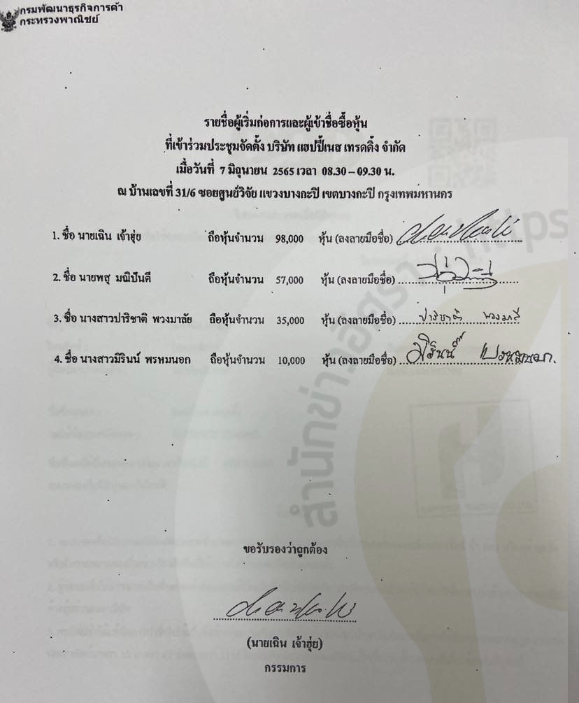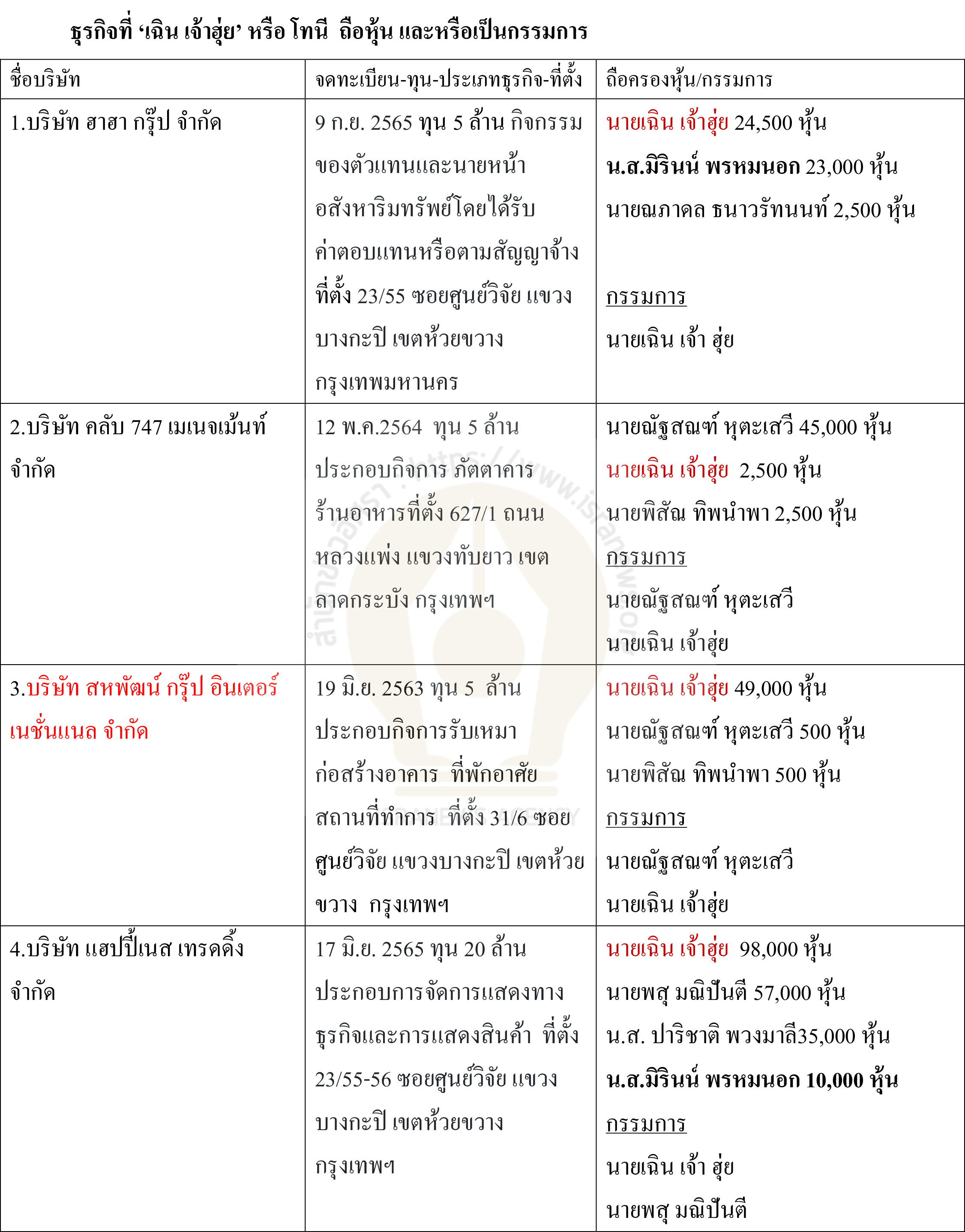 4.บริษัท แฮปปี้เนส เทรดดิ้ง จำกัด จดทะเบียนวันที่ 17 มิ.ย. 2565 ทุน 20 ล้านบาท ประกอบการจัดการแสดงทางธุรกิจและการแสดงสินค้า ที่ตั้งเลขที่ 23/55-56 ซอยศูนย์วิจัย แขวงบางกะปิ เขตห้วยขวาง กรุงเทพฯ นายเฉิน เจ้าฮุ่ย ถือหุ้นใหญ่ 98,000 หุ้น นายพสุ มณิปันตี 57,000 หุ้น น.ส. ปาริชาติ พวงมาลัย 35,000 หุ้น และ น.ส.มิรินน์ พรหมนอก 10,000 หุ้น นายเฉิน เจ้าฮุ่ย และ นายพสุ มณิปันตี เป็นกรรมการ