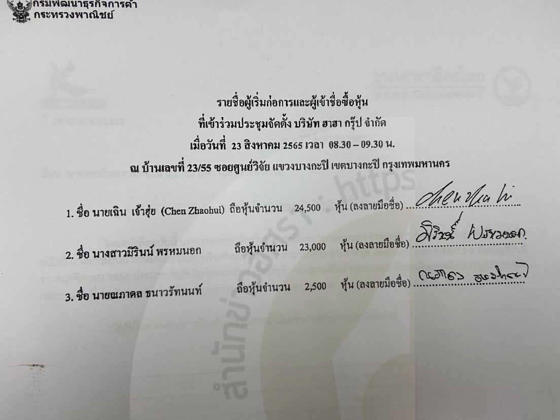 1.บริษัท ฮาฮา กรุ๊ป จำกัด จดทะเบียนวันที่ 9 ก.ย. 2565 ทุน 5 ล้านบาท กิจกรรมของตัวแทนและนายหน้าอสังหาริมทรัพย์โดยได้รับ ค่าตอบแทนหรือตามสัญญาจ้าง ที่ตั้งเลขที่ 23/55 ซอยศูนย์วิจัย แขวงบางกะปิ เขตห้วยขวาง กรุงเทพมหานคร นายเฉิน เจ้าฮุ่ย ถือ 24,500 หุ้น น.ส.มิรินน์ พรหมนอก 23,000 หุ้น นายณภาดล ธนาวรัทนนท์ 2,500 หุ้น นายเฉิน เจ้าฮุ่ย เป็นกรรมการ