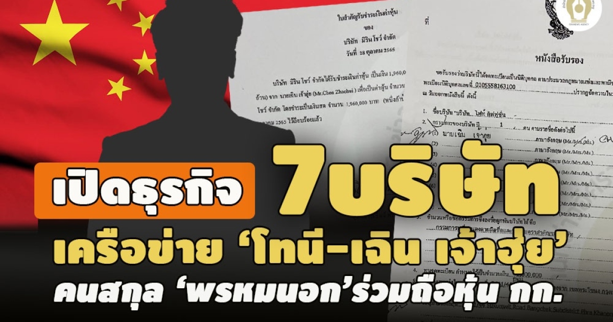 ไม่ใช่แค่ สเปซ พลัส คลับฯ ! เปิดหมดธุรกิจ ‘โทนี-เฉิน เจ้าฮุ่ย’ เครือข่ายทุนจีน มีชื่อ ถือหุ้น-นั่งกก. 7 บริษัท ทั้ง ภัตตาคาร ร้านอาหาร อสังหาฯ รับเหมา จัดแสดงสินค้า มีคนสกุล ‘พรหมนอก’ ร่วมทุน-ก่อตั้ง 3 แห่ง คาบาเร่โชว์ด้วย