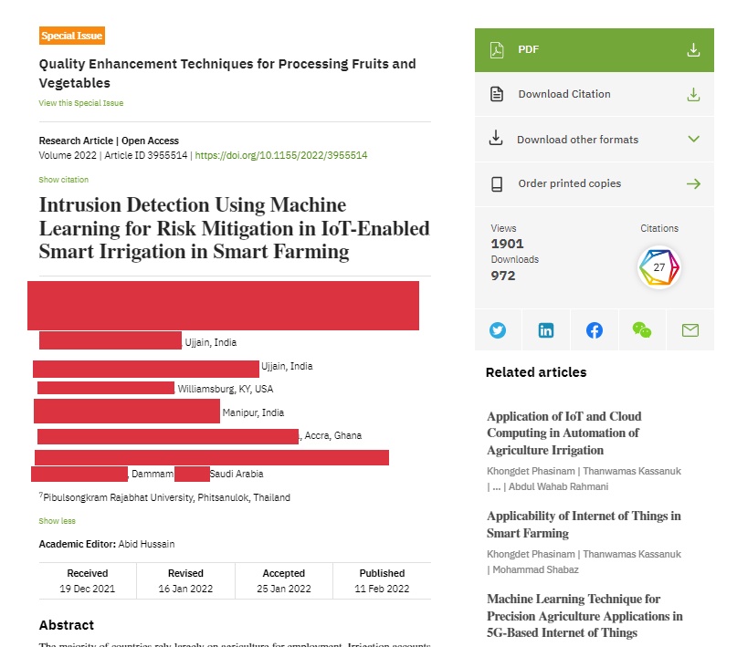 5.Intrusion Detection Using Machine Learning for Risk Mitigation in IoT-Enabled Smart Irrigation in Smart Farming หรือแปลเป็นไทยว่าการตรวจจับการบุกรุกโดยใช้การเรียนรู้ของคอมพิวเตอร์เพื่อลดความเสี่ยงในการชลประทานอัจฉริยะที่เปิดใช้งานระบบอินเทอร์เน็ตในทุกในการทําฟาร์มอัจฉริยะ