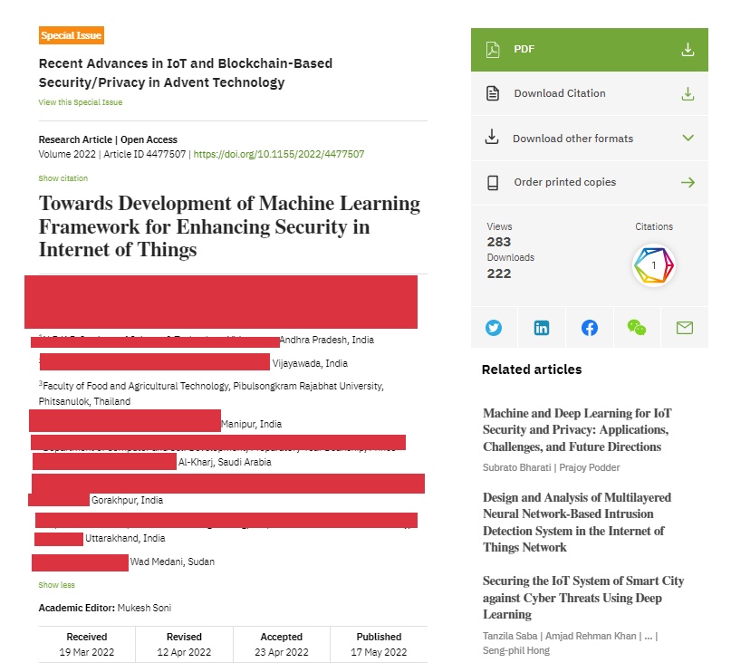 4.Towards Development of Machine Learning Framework for Enhancing Security in Internet of Things หรือแปลเป็นไทยว่าการมุ่งสู่การพัฒนาเฟรมเวิร์กการเรียนรู้ของคอมพิวเตอร์เพื่อเพิ่มความปลอดภัยในระบบอินเทอร์เน็ตในทุกสิ่ง เป็นงานวิจัยเพียงชิ้นเดียวของนายซีที่ปรากฎอยู่บนเว็บ Hindawi ที่ระบุว่าอยู่ในประเภทเครือข่ายความปลอดภัยและการสื่อสาร