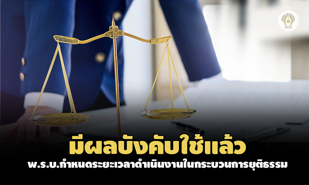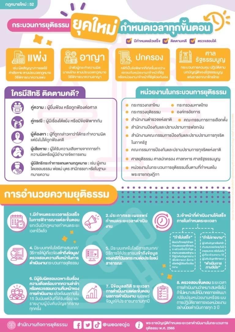 "...พระราชบัญญัติกำหนดระยะเวลาดำเนินงานในกระบวนการยุติธรรม พ.ศ. 2565 มีผลบังคับใช้ โดยให้กำหนดระยะเวลาดำเนินงานในกระบวนการยุติธรรมทุกขั้นตอนให้ชัดเจน ประชาชนได้รับความยุติธรรมโดยไม่ล่าช้า สามารถตรวจสอบความคืบหน้าการทำงานของหน่วยงานในกระบวนการยุติธรรมได้..."
