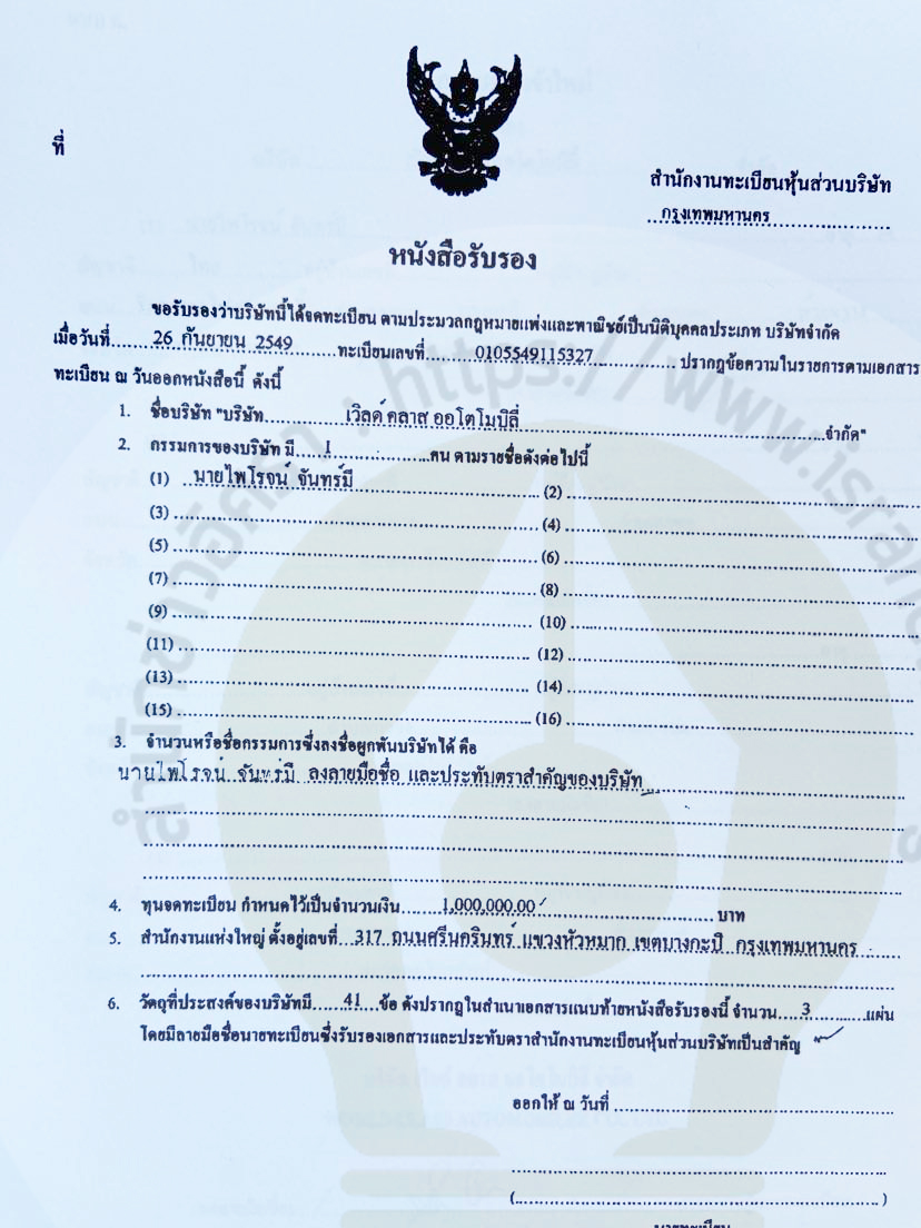 จากการตรวจสอบข้อมูลกับกรมพัฒนาธุรกิจการค้าพบว่า บริษัท เวิลด์ คลาส ออโตโมบิลี่ จำกัด จดทะเบียนวันที่ 26 ก.ย. 2549 ทุน 1 ล้านบาท ประกอบการขายยานยนต์ใหม่ชนิดรถยนต์นั่งส่วนบุคคลรถกระบะรถตู้ และรถขนาดเล็กที่คล้ายกัน ที่ตั้งเลขที่ 317 ถนนศรีนครินทร์ แขวงหัวหมาก เขตบางกะปิ กรุงเทพมหานคร นายยรรยงค์ แสงสง่าพงษ์ เป็นกรรมการ ผู้ถือหุ้น 9 คน ในจำนวนนี้เป็นสัญชาติ กรีก 3 คน นางสาวจารุวรรณ ใจจิต (แจ้งที่อยู่ อ.งาว จ.ลำปาง) ถือหุ้นใหญ่ 4,000 หุ้น จากทั้งหมด 10,000 หุ้น หลังจากนั้นจดทะเบียนเปลี่ยนแปลงหลายครั้ง