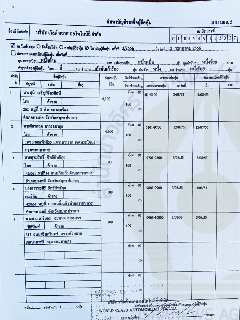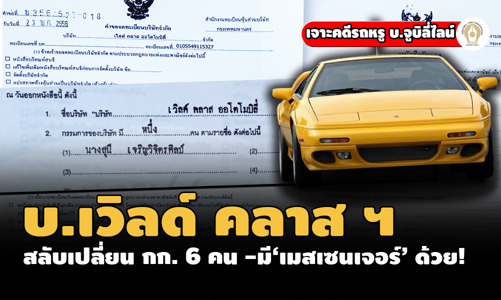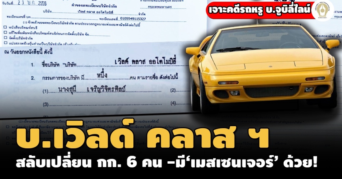 ไขสำนวนคดีรถหรู บ.จูบิลี่ไลน์ กับพวก ก่อน อสส. ชี้ขาดสั่งฟ้อง ‘เสรี รักวิทย์-ชินบารมี’ (ตอน 4 ) : เจาะข้อมูล ‘เวิลด์ คลาส ออโตโมบิลี่’ พบจดทะเบียนเปลี่ยนผู้ถือหุ้น -กก. ยิบรวม 16 ครั้ง ‘สุนี เจริญวิจิตรศิลป์’ - จักรกฤต ถาวรธนากุล’ กับพวก 4 คน พนักงาน‘เมสเซนเจอร์’บริษัทนิช คาร์ โผล่ร่วมด้วย
