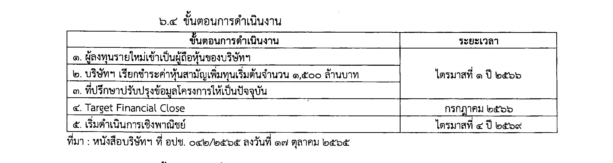3.นอกจากนี้ ในช่วงไตรมาสที่ 1 ปี 2566 บริษัทฯ จะเรียกชำระค่าหุ้นสามัญเพิ่มทุนเริ่มต้น จำนวนประมาณ 1,500 ล้านบาท คิดเป็นสัดส่วนของกระทรวงการคลังจำนวนประมาณ 300 ล้านบาท โดยมีวัตถุประสงค์เพื่อนำเงินมาใช้ในการชำระหนี้สินบางส่วนและใช้เป็นเงินหมุนเวียนในบริษัทฯ เพื่อดำเนินการขอวงเงินสินเชื่อ
