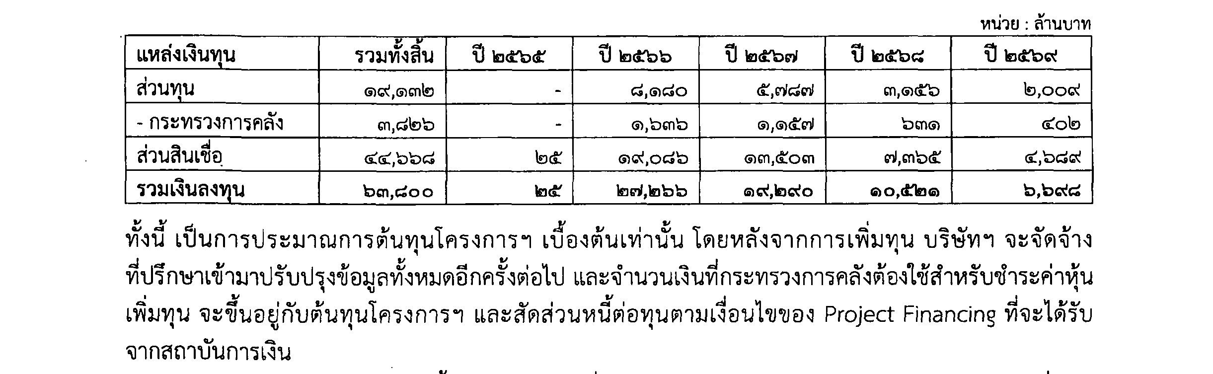 “…บริษัทฯ จึงวางแผนที่จะเรียกชำระค่าหุ้นเพิ่มทุนเพื่อจะได้ดำเนินโครงการฯ ต่อไป และมีเงินทุนในการจ้างที่ปรึกษา โดยสำหรับสัดส่วนการถือหุ้นของกระทรวงการคลังร้อยละ 20 ของทุนจดทะเบียน รัฐบาลต้องจัดสรรงบประมาณสำหรับโครงการฯประมาณ 4,000 ล้านบาท ทั้งนี้ ขึ้นอยู่กับต้นทุนโครงการฯ…”
