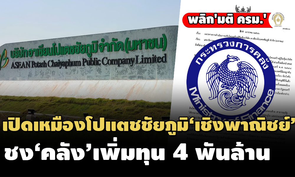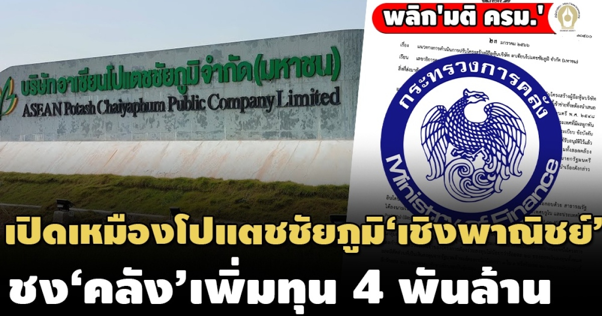 ในการประชุมคณะรัฐมนตรี (ครม.) เมื่อวันที่ 24 ม.ค.ที่ผ่านมา ครม.รับทราบแนวทาง ‘การปรับโครงสร้างผู้ถือหุ้น’ บริษัท อาเซียนโปแตชชัยภูมิ จำกัด (มหาชน) โดยสงวนสิทธิ์ในการเพิ่มทุน เพื่อรักษาสัดส่วนการถือหุ้นของรัฐบาลไทยในการเป็นเจ้าของ ‘โครงการทำเหมืองแร่โปแตช’ อ.บำเหน็จณรงค์ จ.ชัยภูมิ ไม่น้อยกว่า 1 ใน 3 หรือไม่น้อยกว่าร้อยละ 20