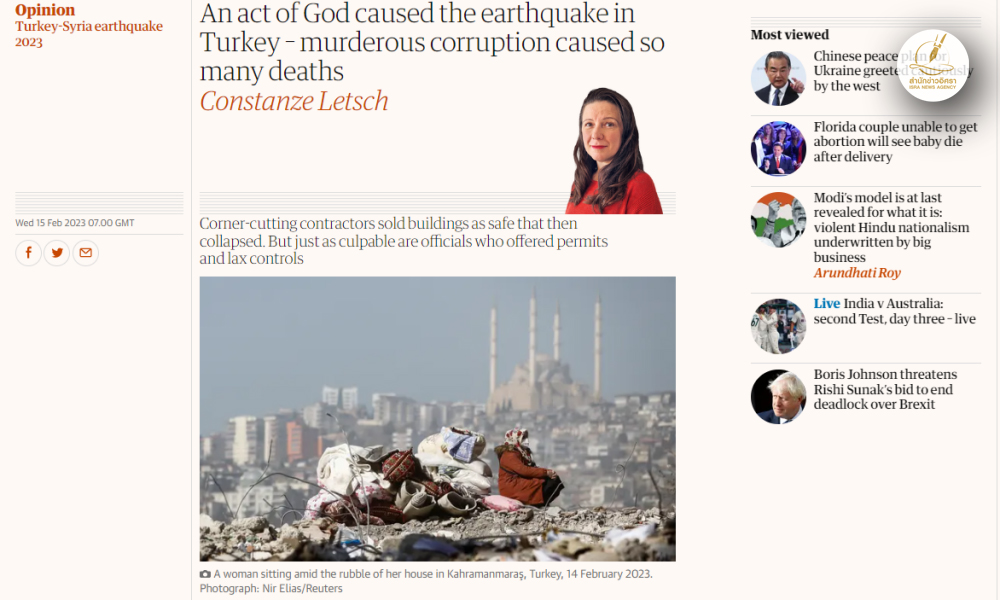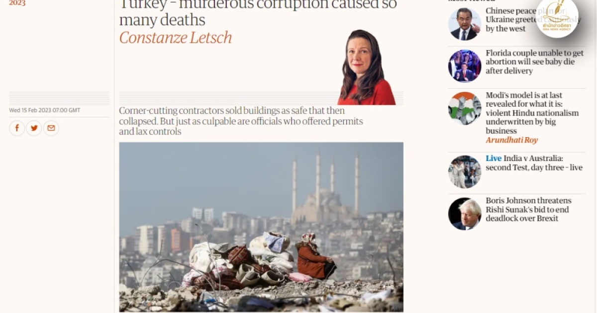 ส่องคดีทุจริตโลก สำนักข่าวอิศรา (www.isranews.org) ในสัปดาห์นี้ขอนำเสนอกรณีการทุจริตที่อาจเป็นสาเหตุทำให้มีผู้เสียชีวิตในเหตุการณ์แผ่นดินไหวที่ประเทศตุรเคียและประเทศซีเรียไปมากกว่า 46,000 ศพไปแล้ว (ข้อมูลล่าสุดวันที่ 18 ก.พ.)