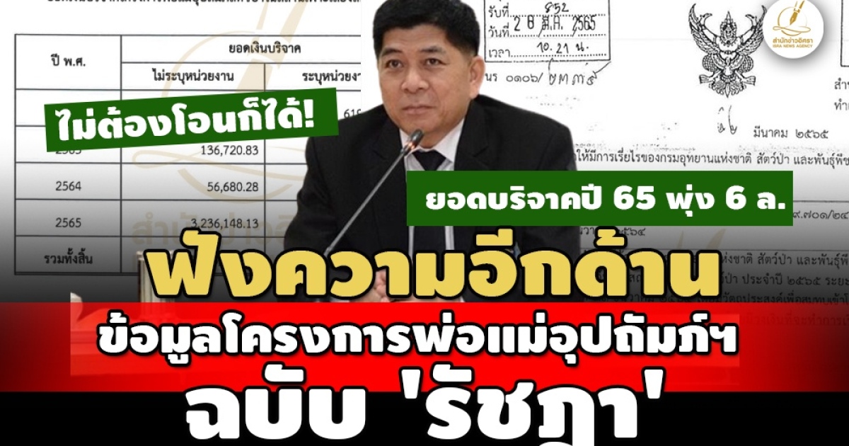 กรณี สำนักข่าวอิศรา (www.isranews.org) ตรวจสอบข้อมูลเบื้องต้นโครงการพ่อแม่อุปถัมภ์สัตว์ป่า ที่นายรัชฎา สุริยกุล ณ อยุธยา อดีตอธิบดีกรมอุทยานแห่งชาติ สัตว์ป่า และพันธุ์พืช ยืนยันว่าซองเงินที่พบในห้องทำงานส่วนหนึ่งเป็นเงินทำบุญในโครงการฯ นี้ มานำเสนอให้สาธารณชนได้รับทราบไปแล้ว