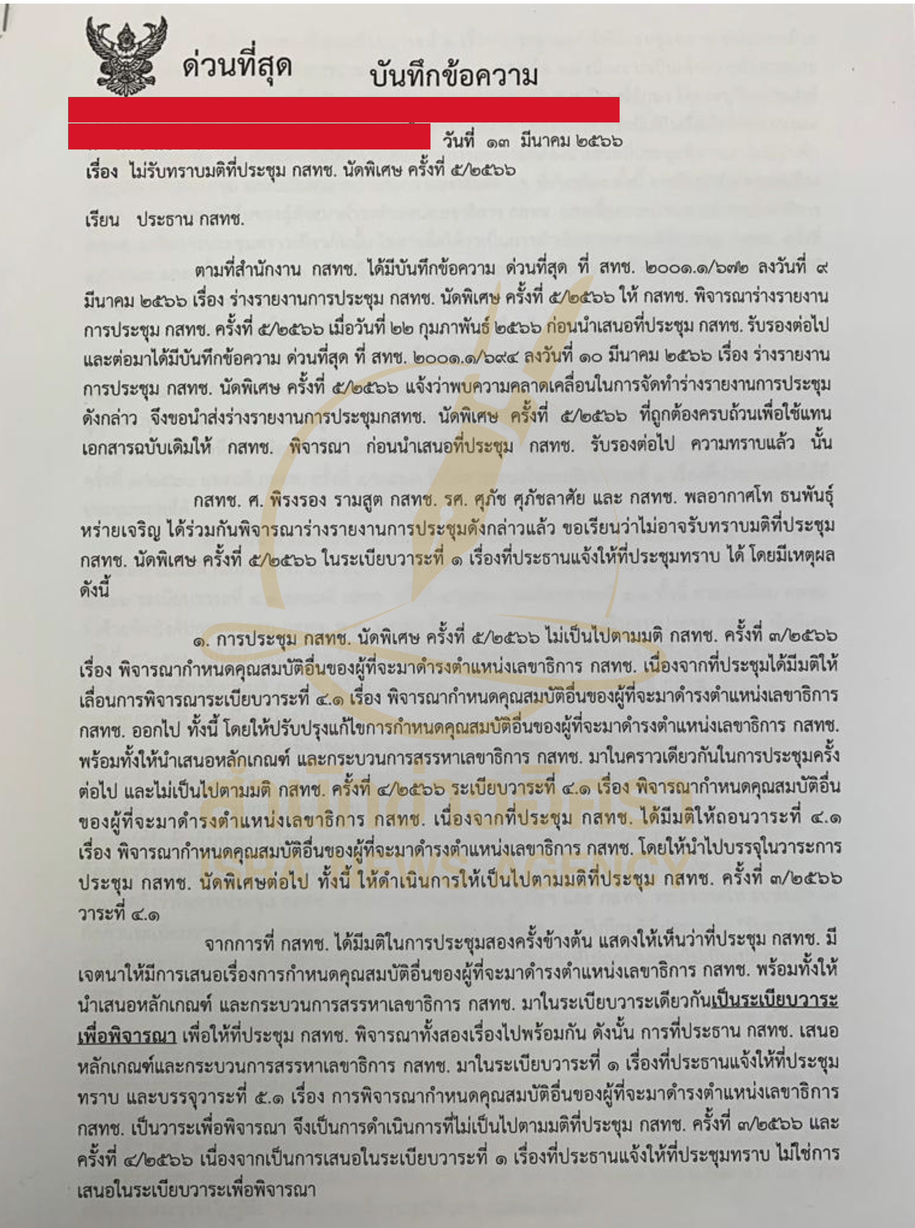หลังจาก กสทช. 3 ราย ได้แก่ ศ.ดร.พิรงรอง รามสูต ,รศ.ดร.ศุภัช ศุภชลาศัย และ พล.อ.ท.ดร.ธนพันธุ์ หร่ายเจริญ ลงนามหนังสือแจ้งไปยัง นพ.สรณ บุญใบชัยพฤกษ์ ประธาน กสทช. ว่า มติที่ประชุม กสทช. นัดพิเศษ ครั้งที่ 5/2566 ที่มีมติ ให้ ‘ประธาน กสทช.’ เป็นผู้ทำหนังสือเชิญทาบทามและคัดเลือกบุคคลที่จะมาทำหน้าที่เป็น ‘เลขาธิการ กสทช.’ และส่งให้บอร์ด กสทช. เห็นชอบ นั้น
