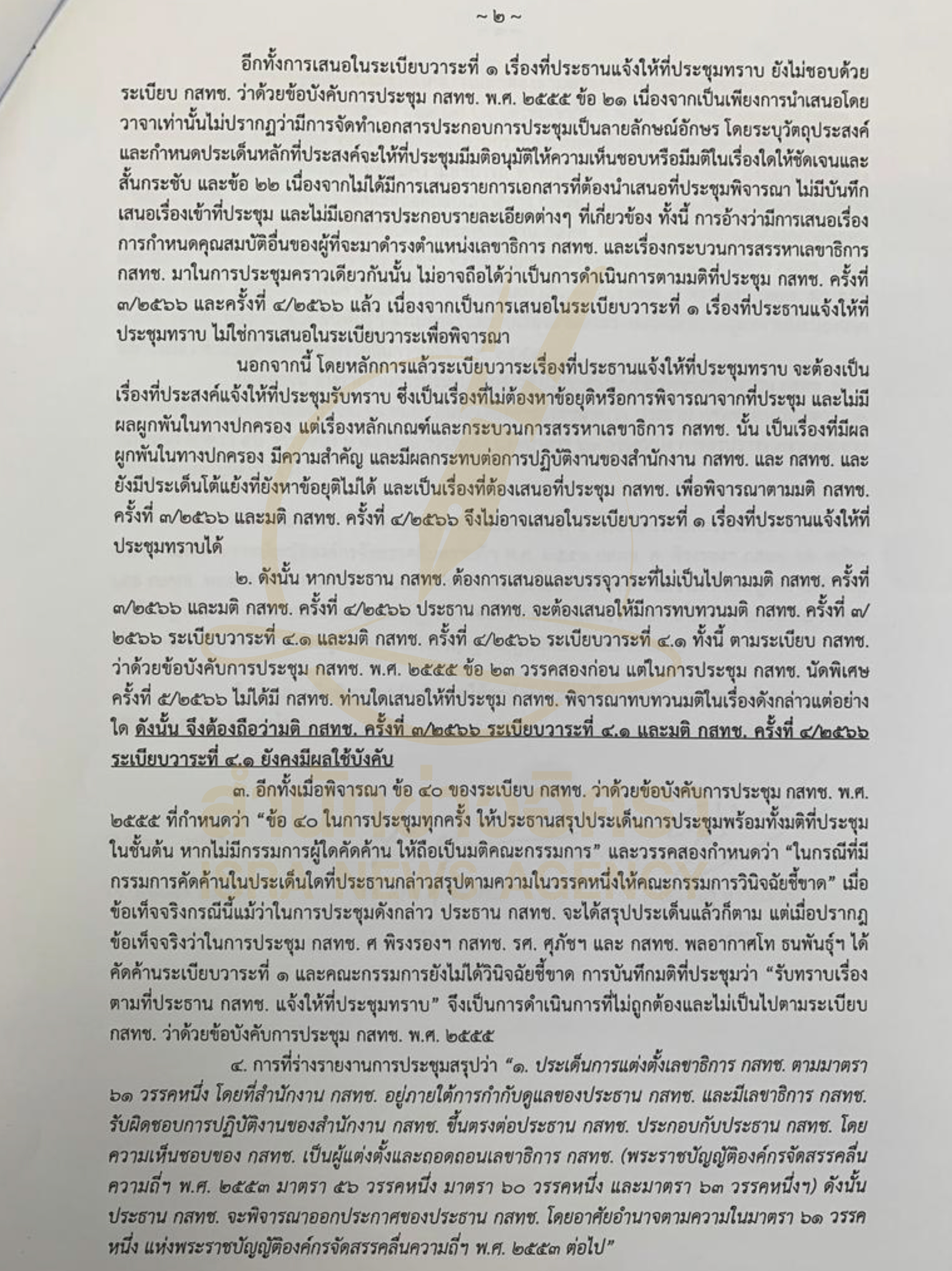 กรรมการ กสทช. ทั้ง 3 ราย จึงไม่อาจรับทราบมติที่ประชุม กสทช. นัดพิเศษ ครั้งที่ 5/2566 เมื่อวันที่ 7 มี.ค.2566 ระเบียบวาระที่ 1 เรื่อง ที่ประธาน กสทช. แจ้งให้ที่ประชุมทราบ ได้ (อ่านประกอบ : ส่อขัดกม.-มีโทษอาญา! 3 กสทช.แจ้ง‘นพ.สรณ’ ไม่รับ‘มติ’ยกอำนาจให้‘ประธาน’เลือกเลขาธิการฯ)