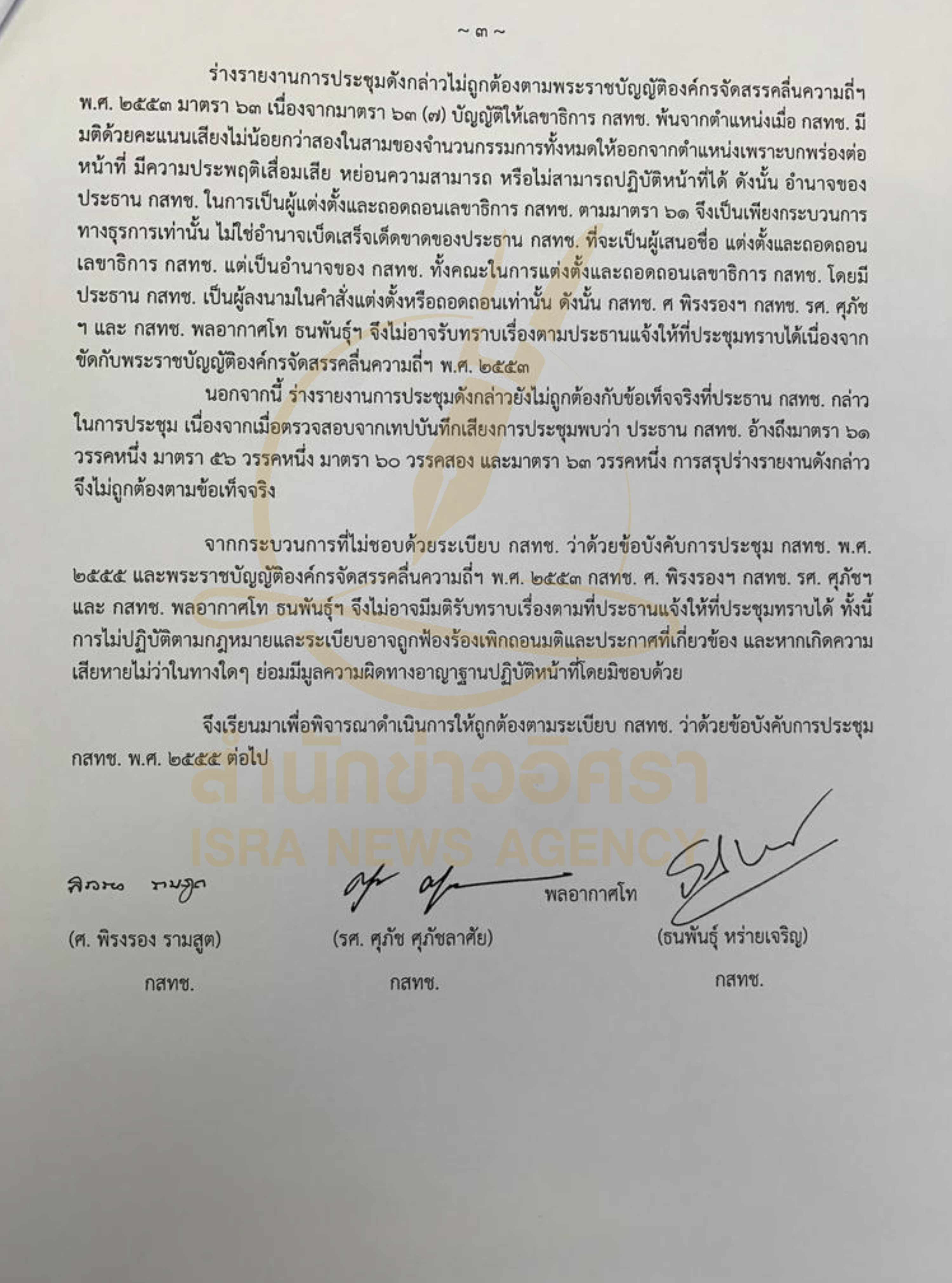 ทั้งนี้ การไม่ปฏิบัติตามกฎหมายและระเบียบอาจถูกฟ้องร้องเพิกถอนมติและประกาศที่เกี่ยวข้อง และหากเกิดความเสียหายไม่ว่าในทางใดๆ ย่อมมีมูลความผิดทางอาญาฐานปฏิบัติหน้าที่โดยมิชอบด้วย จึงเรียนมาเพื่อพิจารณาดำเนินการให้ถูกต้องตามระเบียบ กสทช. ว่าด้วยข้อบังคับการประชุมกสทช. พ.ศ.2555 ต่อไป” หนังสือที่ลงนาม โดย ศ.ดร.พิรงรอง รามสูต ,พล.อ.ท.ดร.ธนพันธุ์ หร่ายเจริญ และ รศ.ดร.ศุภัช ศุภชลาศัย เมื่อวันที่ 13 มี.ค.2566 ระบุ
