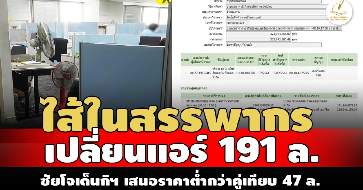 "...ผลการเสนอราคาแข่งขั้นงานนั้น บริษัท ซัยโจ เด็นกิ อินเตอร์เนชั่นแนล จำกัด เสนอราคา 191,844,975.85 บาท , บริษัท นีโอ เอ็นจิเนียริ่ง แอนด์ เซอร์วิส จำกัด เสนอราคา 238,991,154.24 บาท บริษัท ซัยโจ เด็นกิ อินเตอร์เนชั่นแนล จำกัด เสนอราคาต่ำกว่า 47,146,178.39 บาท ได้รับงานไป ..."